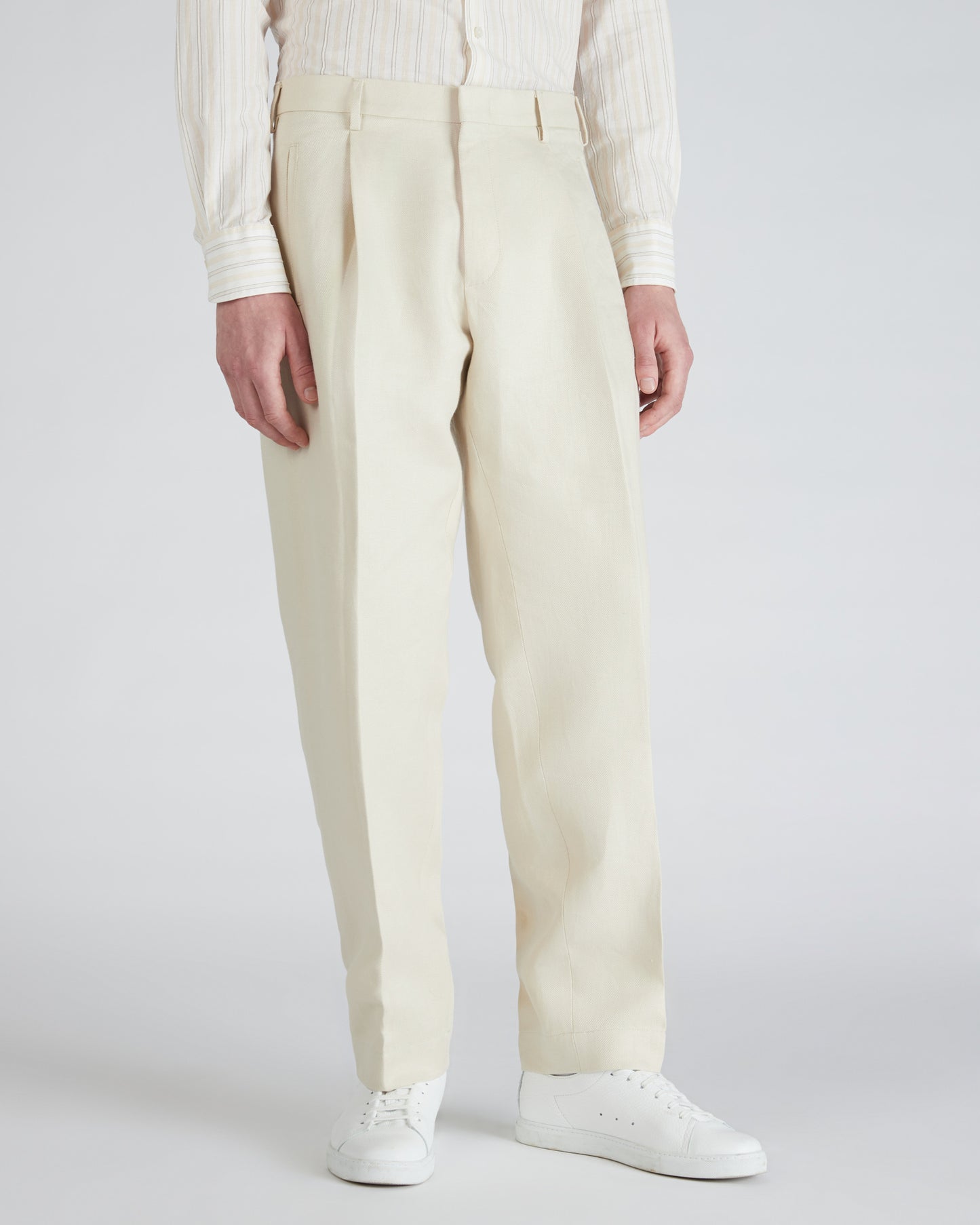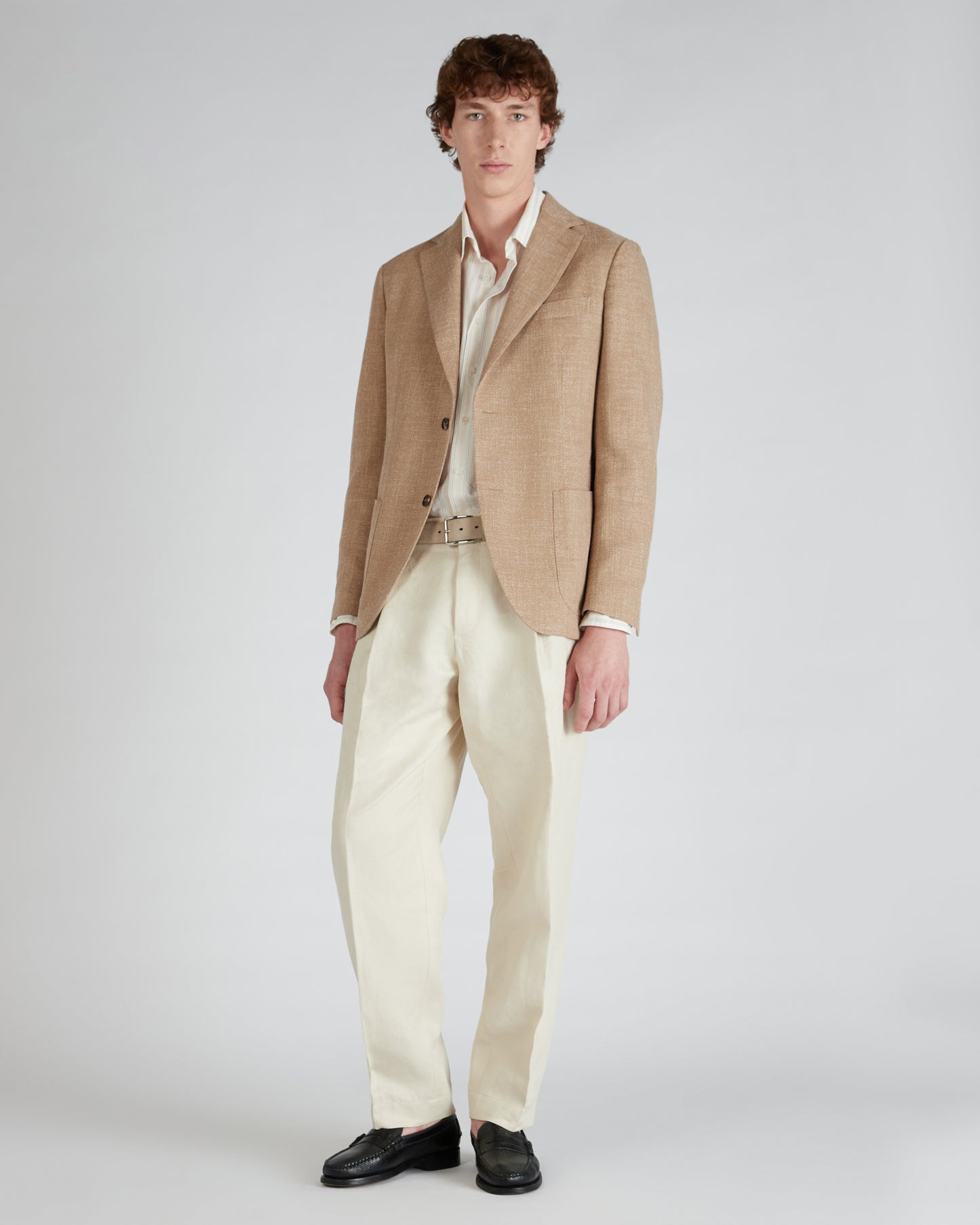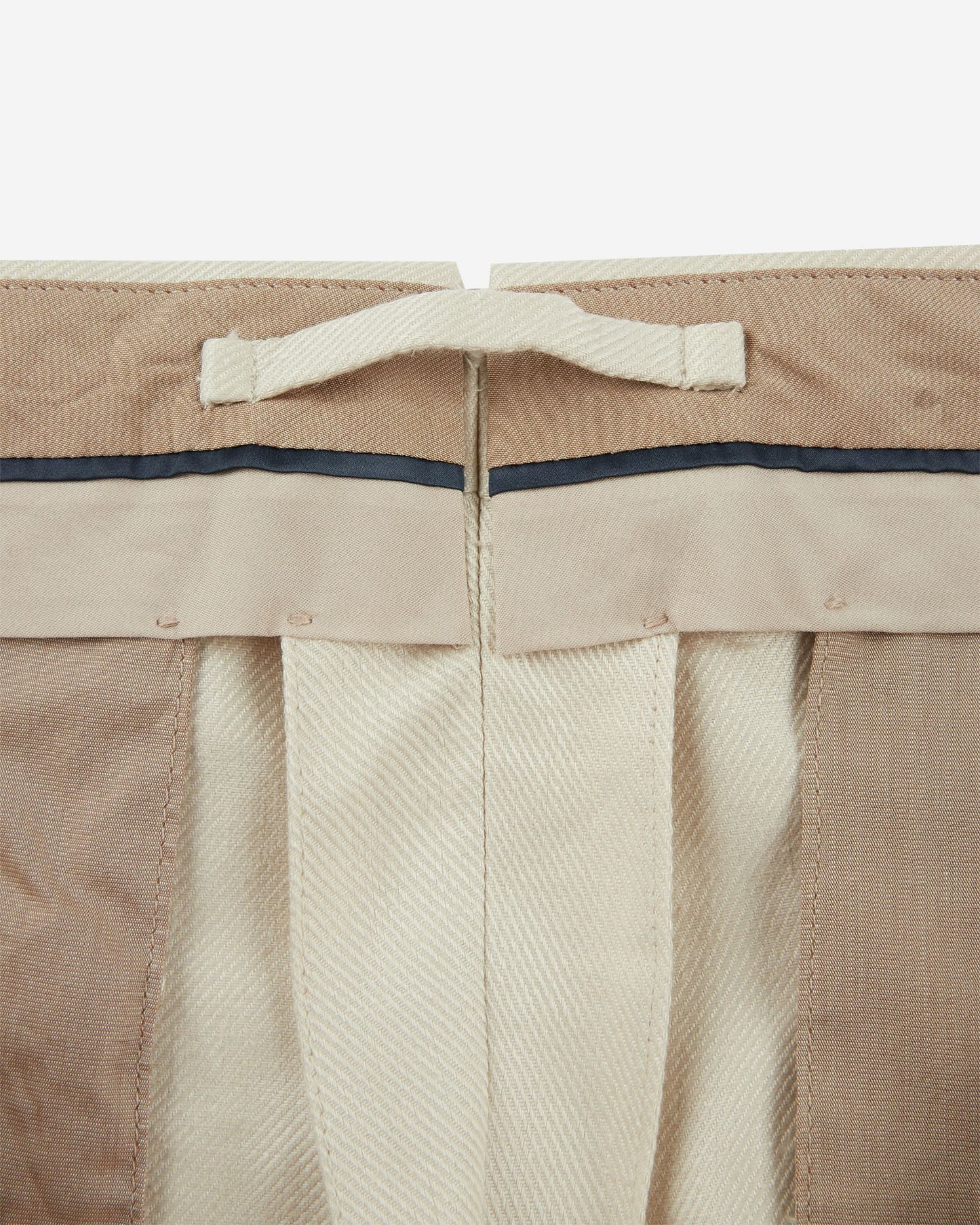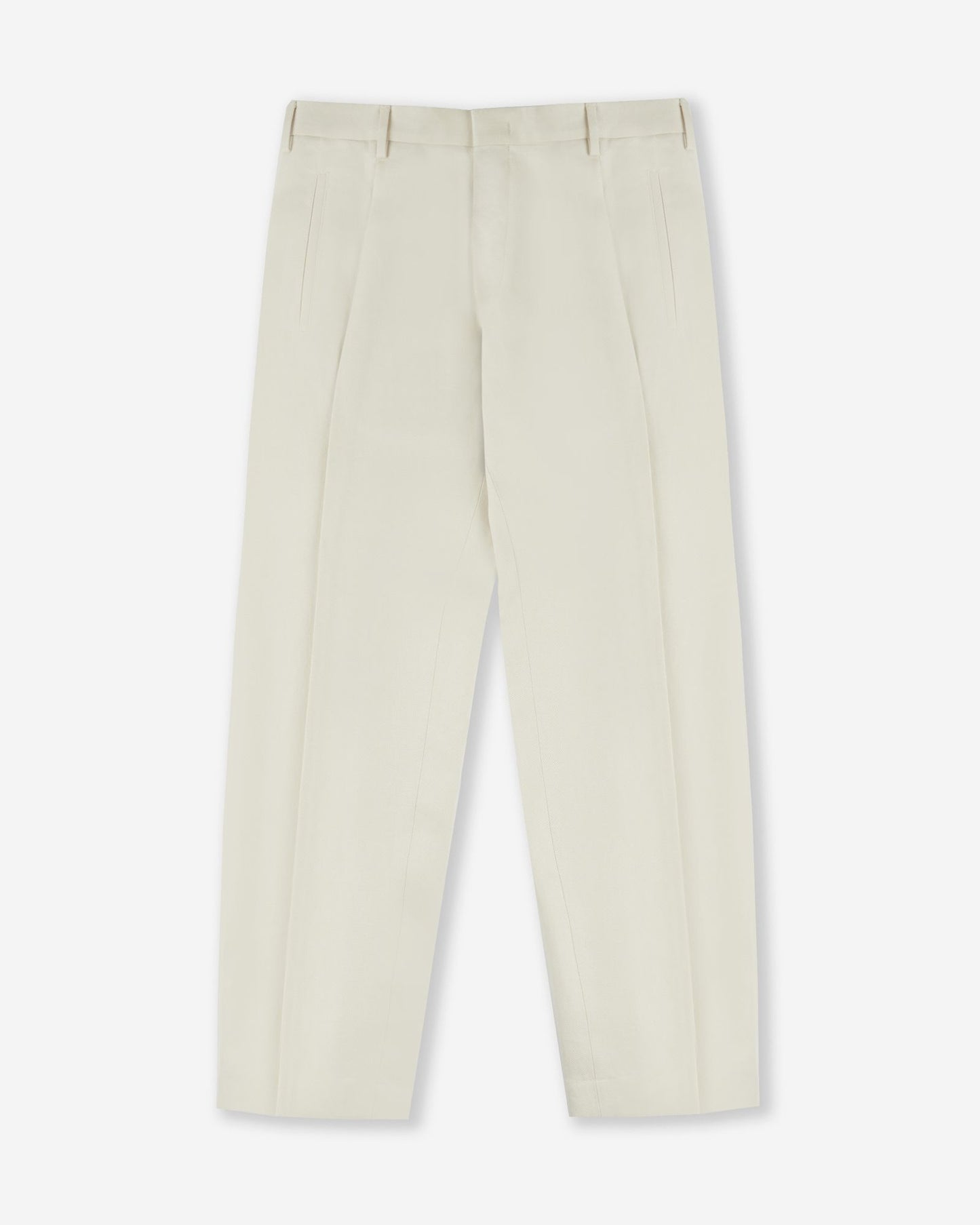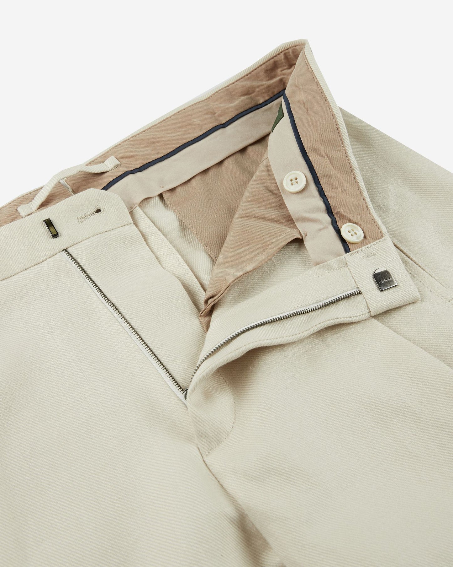 - Il pantalone presenta piega frontale, tasche anteriori a filetto, tasche posteriori monofiletto con bottone.