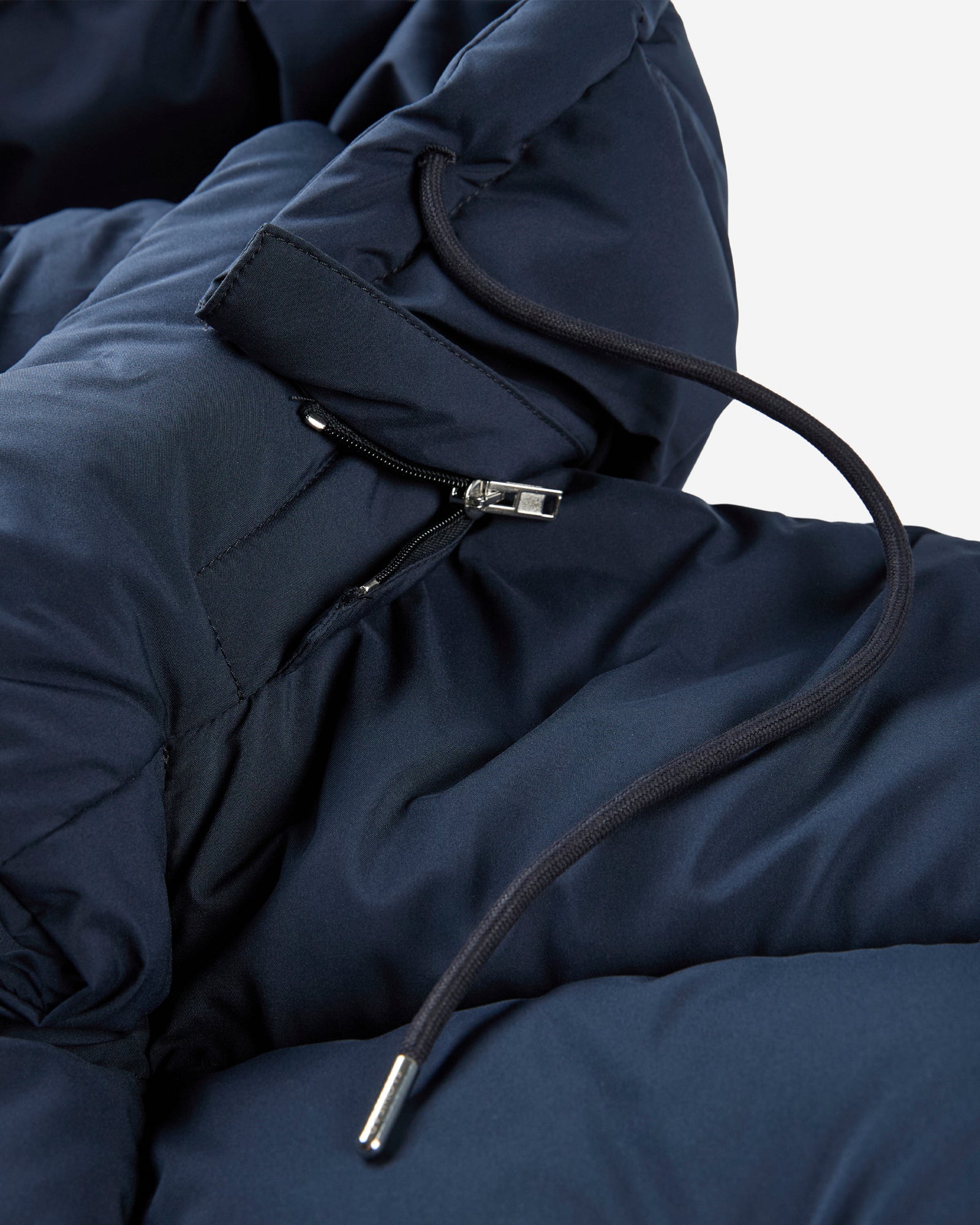 - Il piumino presenta chiusura frontale nascosta con zip a due cursori, tasche in alto con zip, tasche in basso a toppa con pattina.