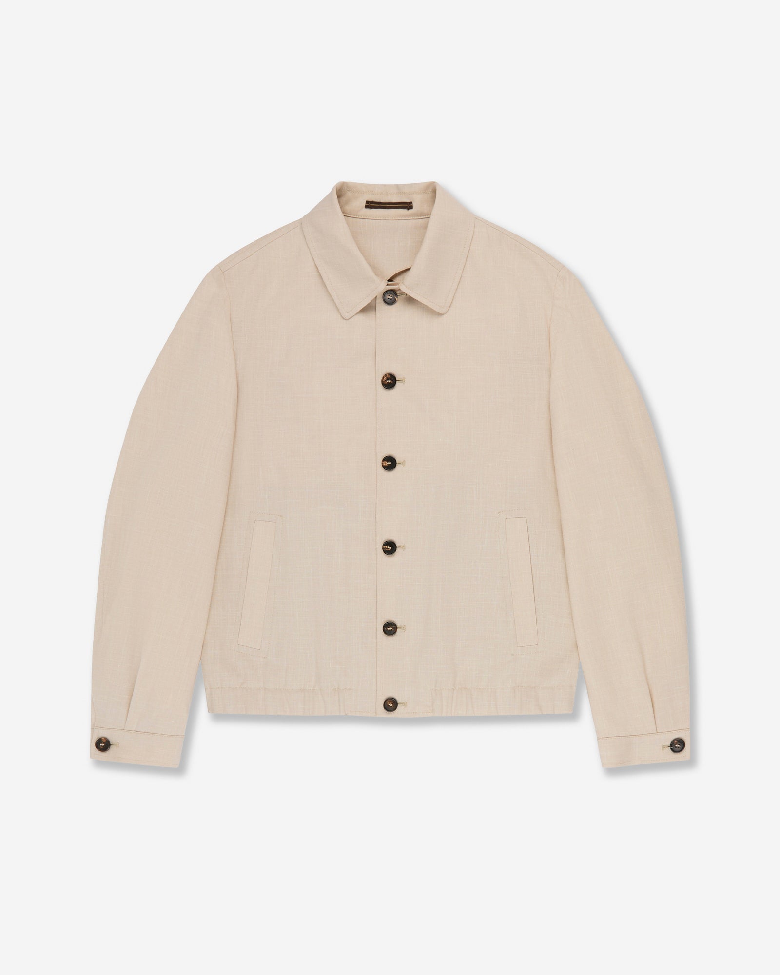 • Il blouson è sfoderato con maniche foderate e presenta chiusura a bottoni, elastico sul fondo, tasche a pistagna con ripiego eseguito manualmente.