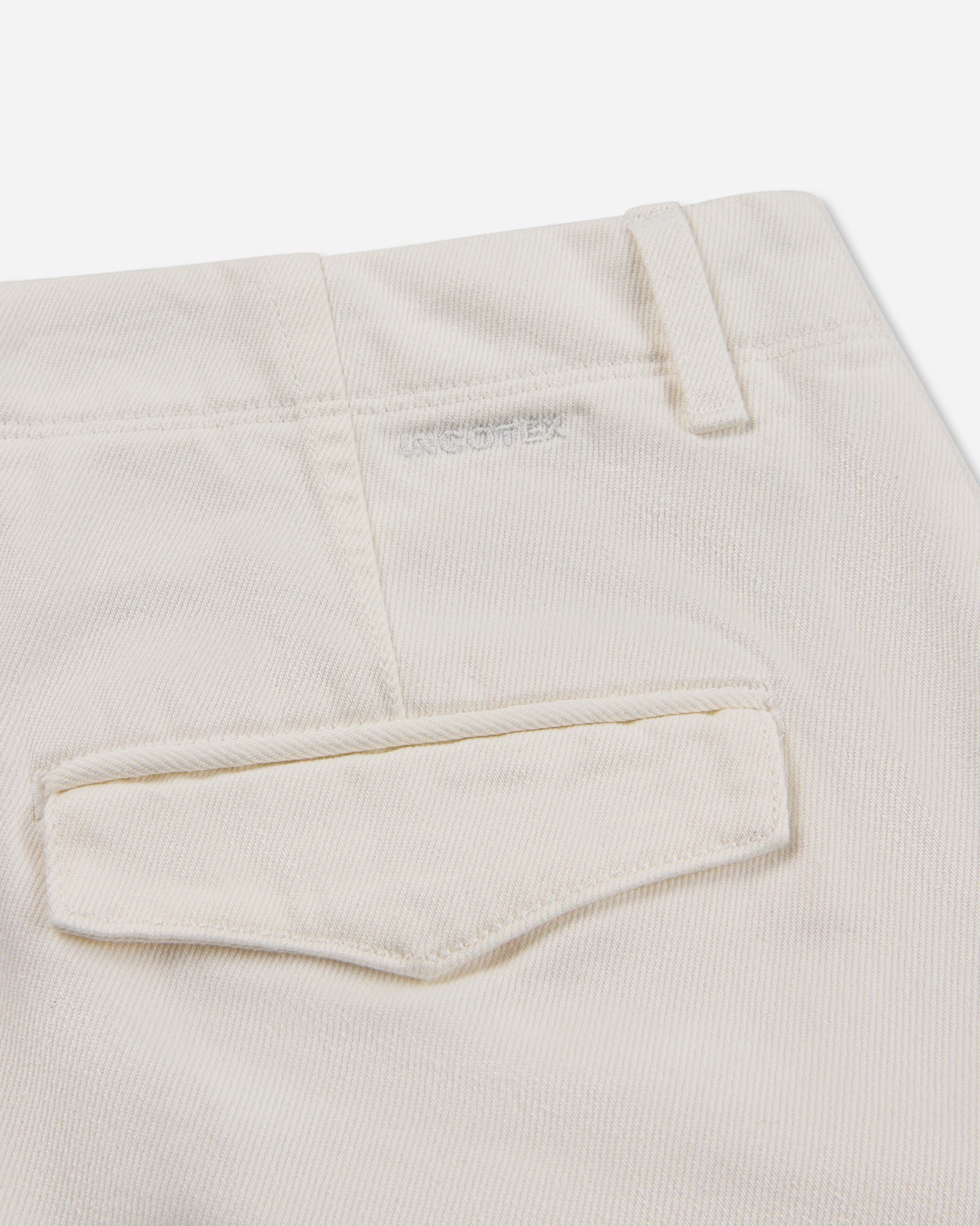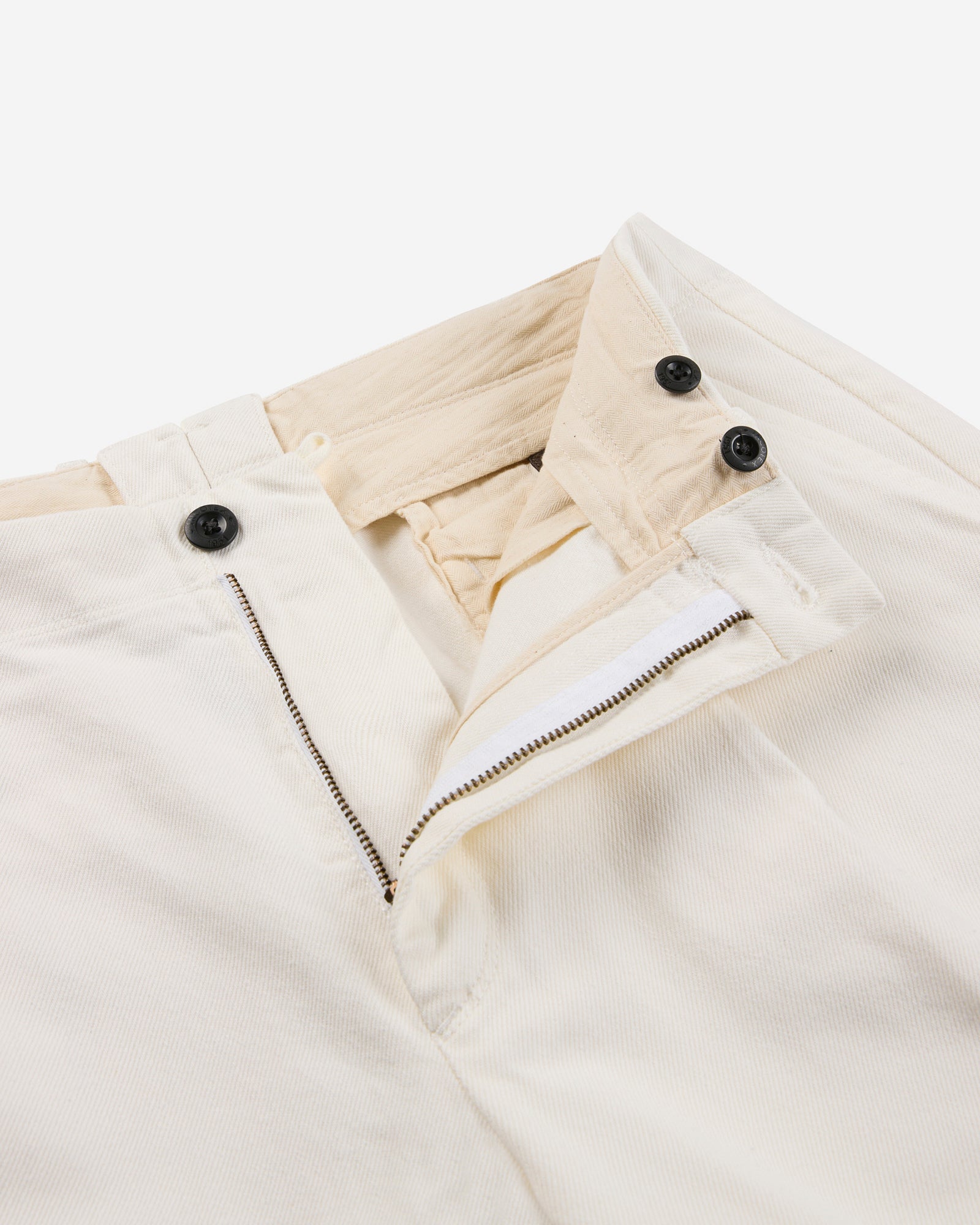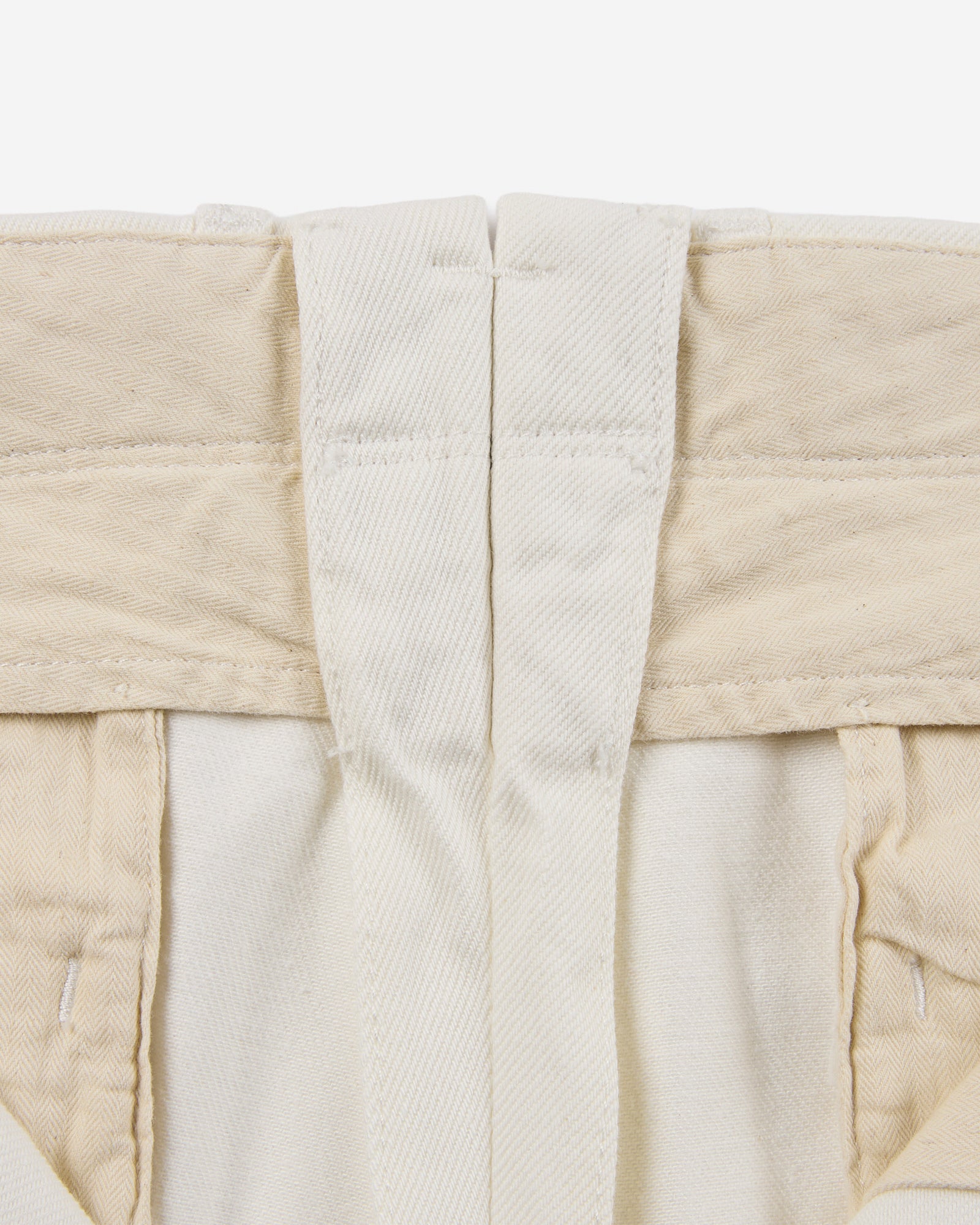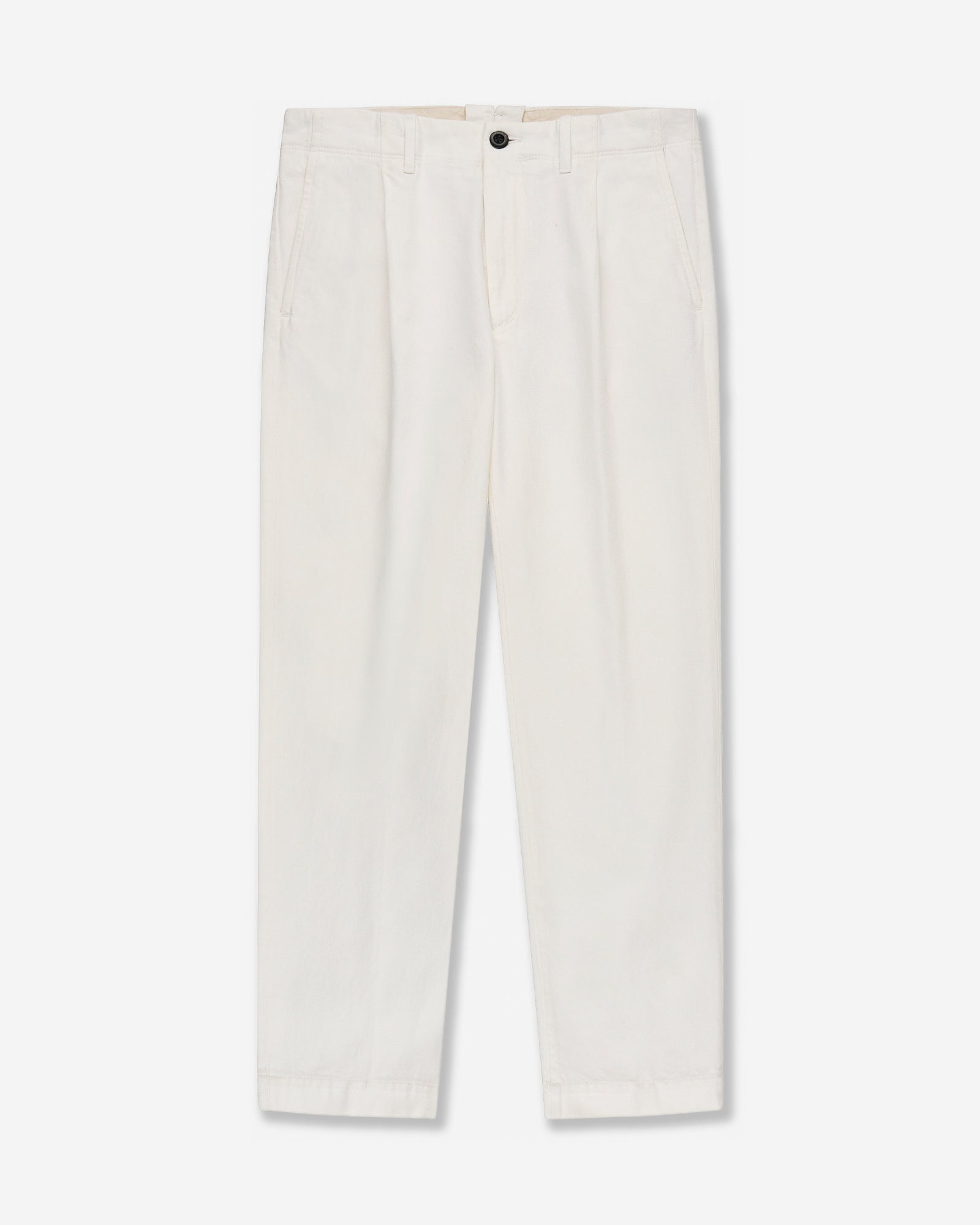 丈夫で格別にタフな風合いが特徴のコットンブルは、秋冬シーズンに求められる保護力と耐久性を確保するのに最適な素材です。;フロントプリーツでゆったり感を強調したリラックスフィットのパンツにこの素材を採用。;コーディネート力抜群のカジュアルムード漂う一本に仕上げています。;