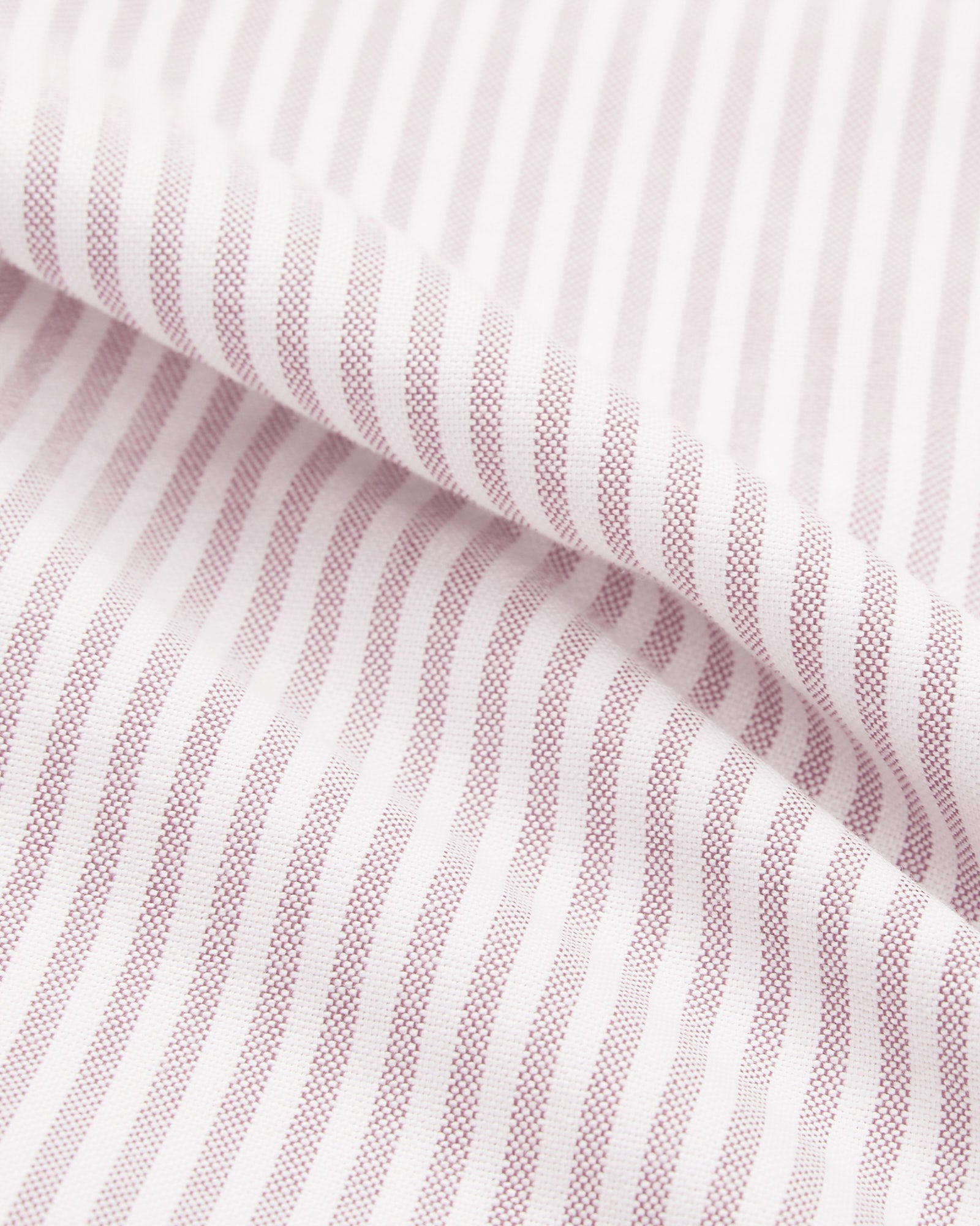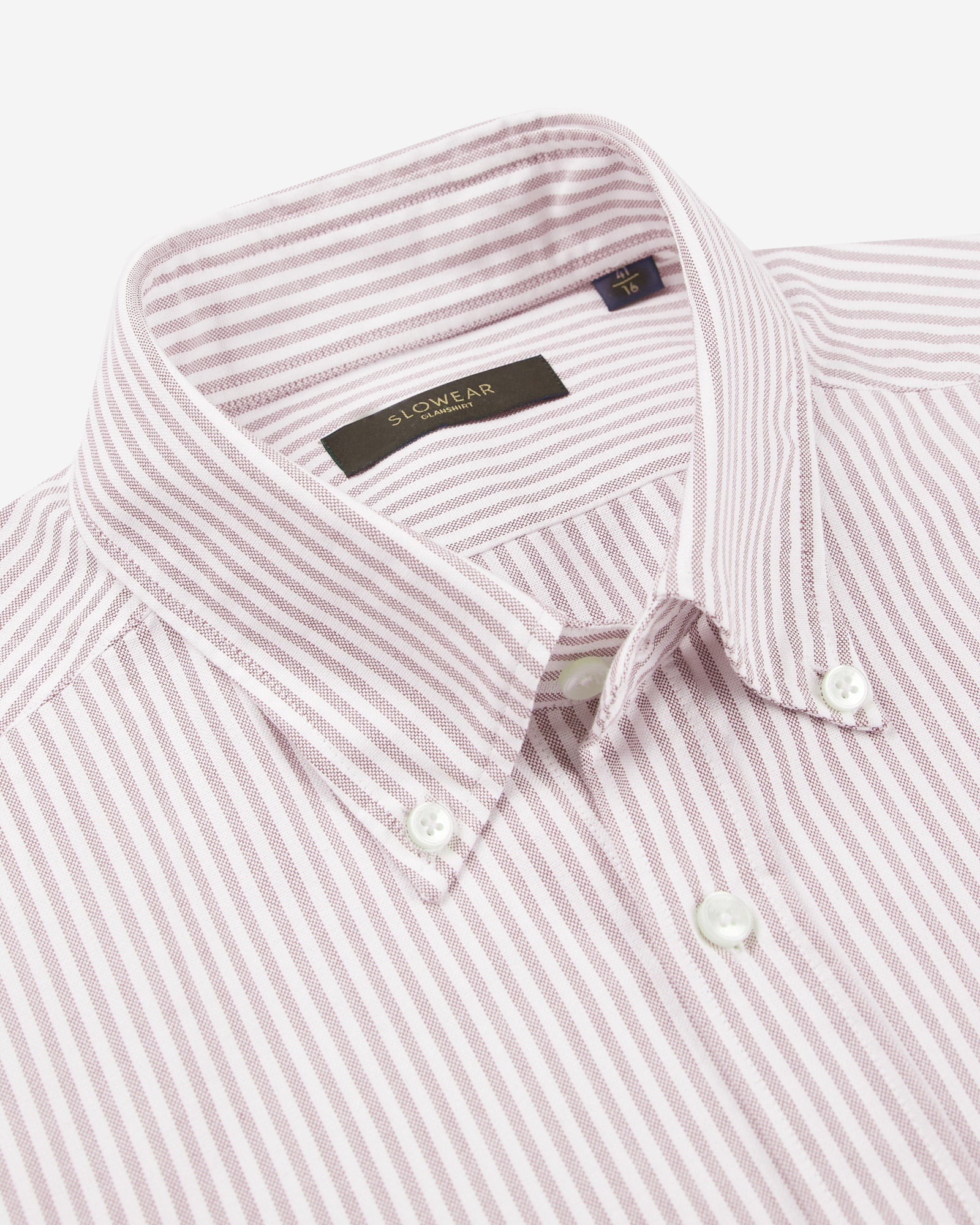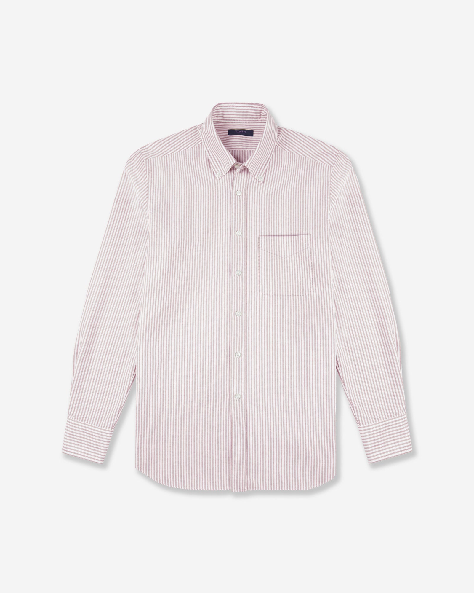 オックスフォードコットンは、シャツやオーバーシャツに最も人気のあるコットンのひとつ。快適性と通気性が高い機能性を実現します。このシャツに使っているコットンは、生産の全てのプロセスにおいて人と環境の安全性を保証していることが認証されています。快適なレギュラーフィットにオリジナルなストライプを施したデザインで提案しました。