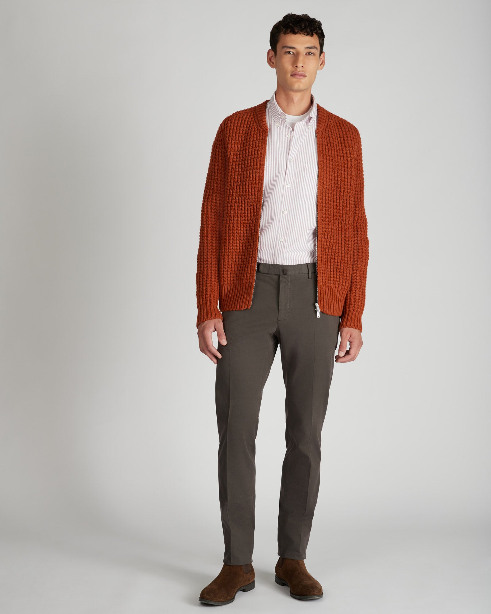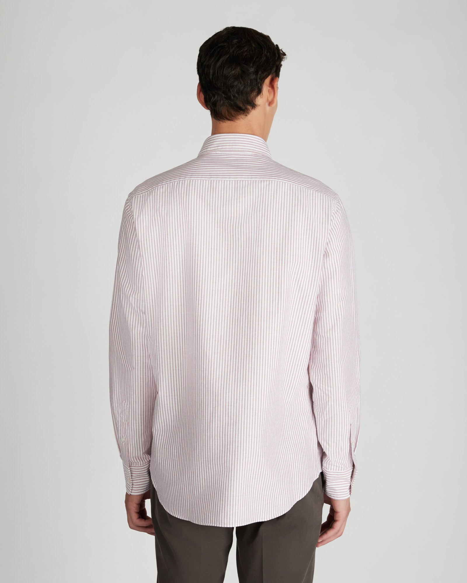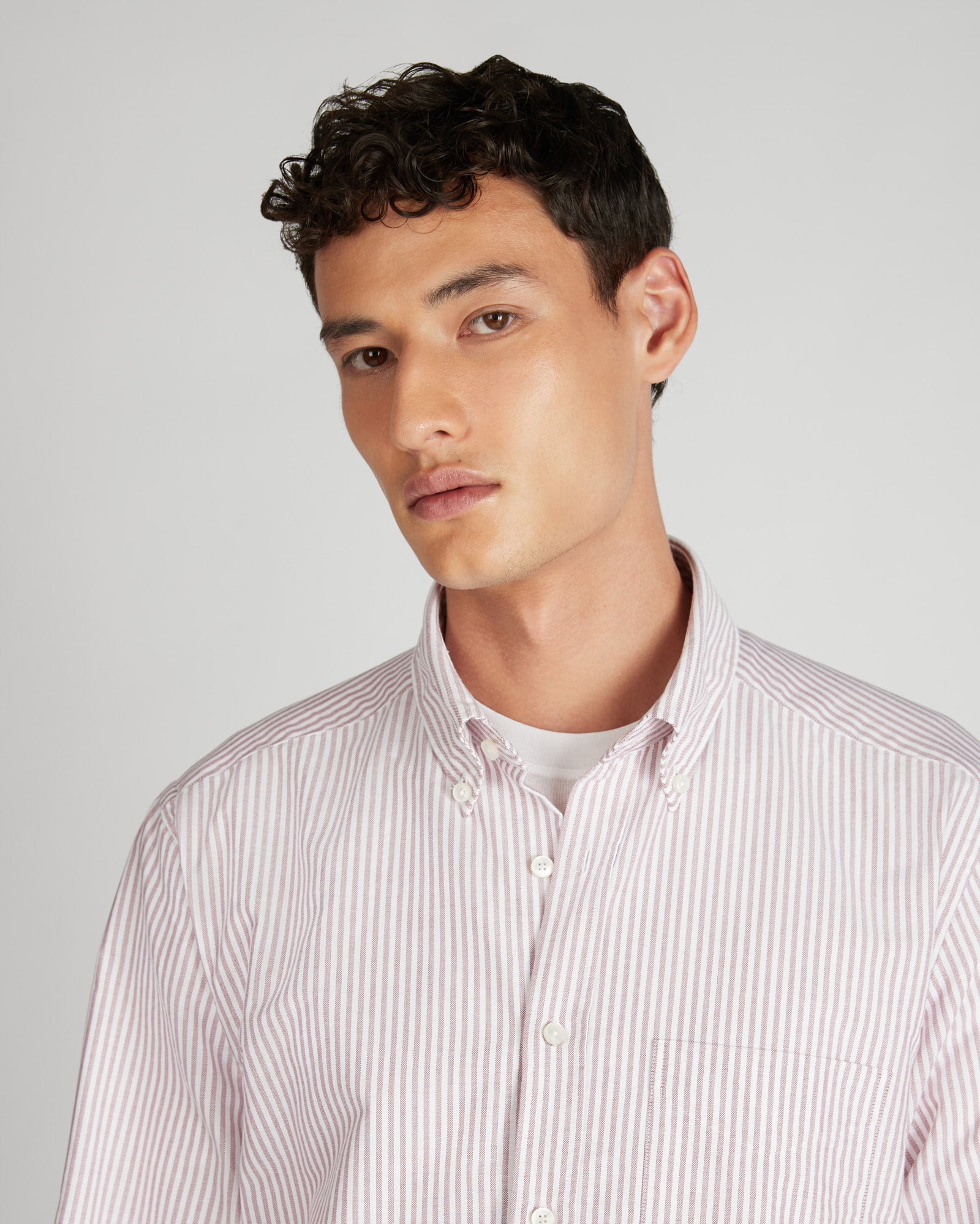オックスフォードコットンは、シャツやオーバーシャツに最も人気のあるコットンのひとつ。快適性と通気性が高い機能性を実現します。このシャツに使っているコットンは、生産の全てのプロセスにおいて人と環境の安全性を保証していることが認証されています。快適なレギュラーフィットにオリジナルなストライプを施したデザインで提案しました。