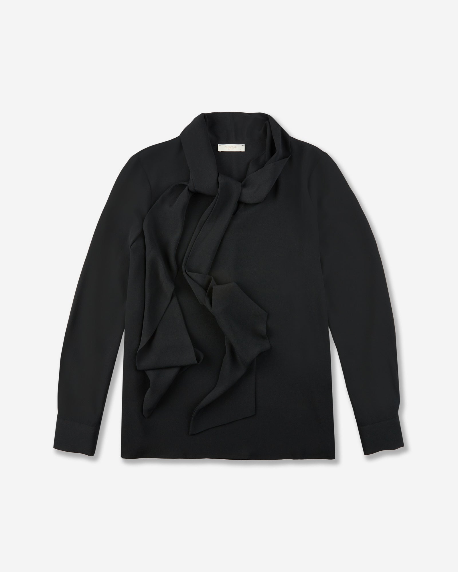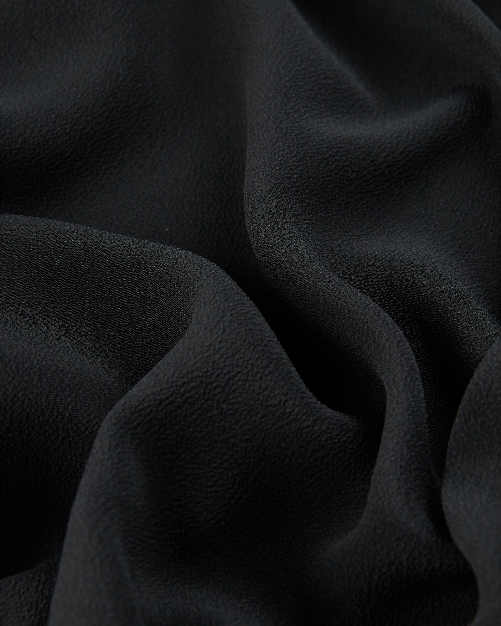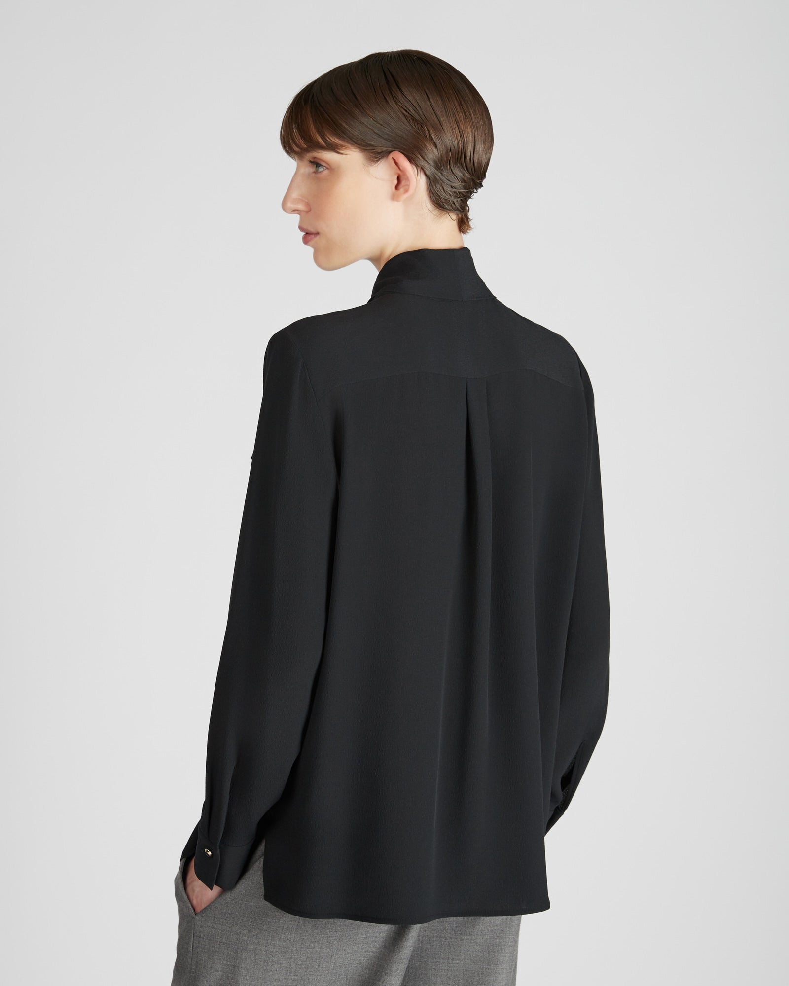 シルクのクレープ・ド・シンは、非常に繊細でエレガントな素材で、ほのかに縮れた軽やかな手触りと洗練された外観が特徴です。首元の開閉を優雅に飾るスカーフデザインという独創的な構造により、このアイテムは高級感あふれる、洗練され唯一無二の一着となっています。