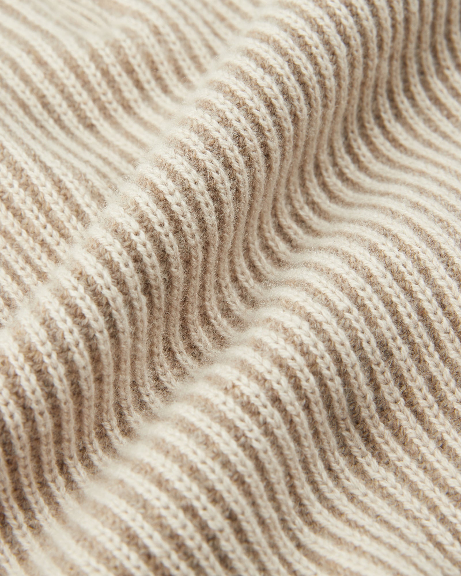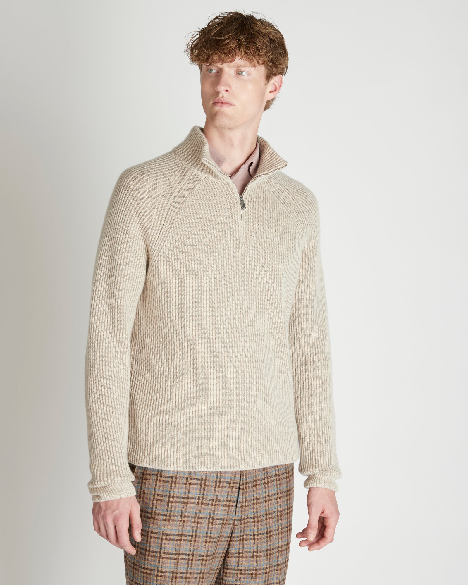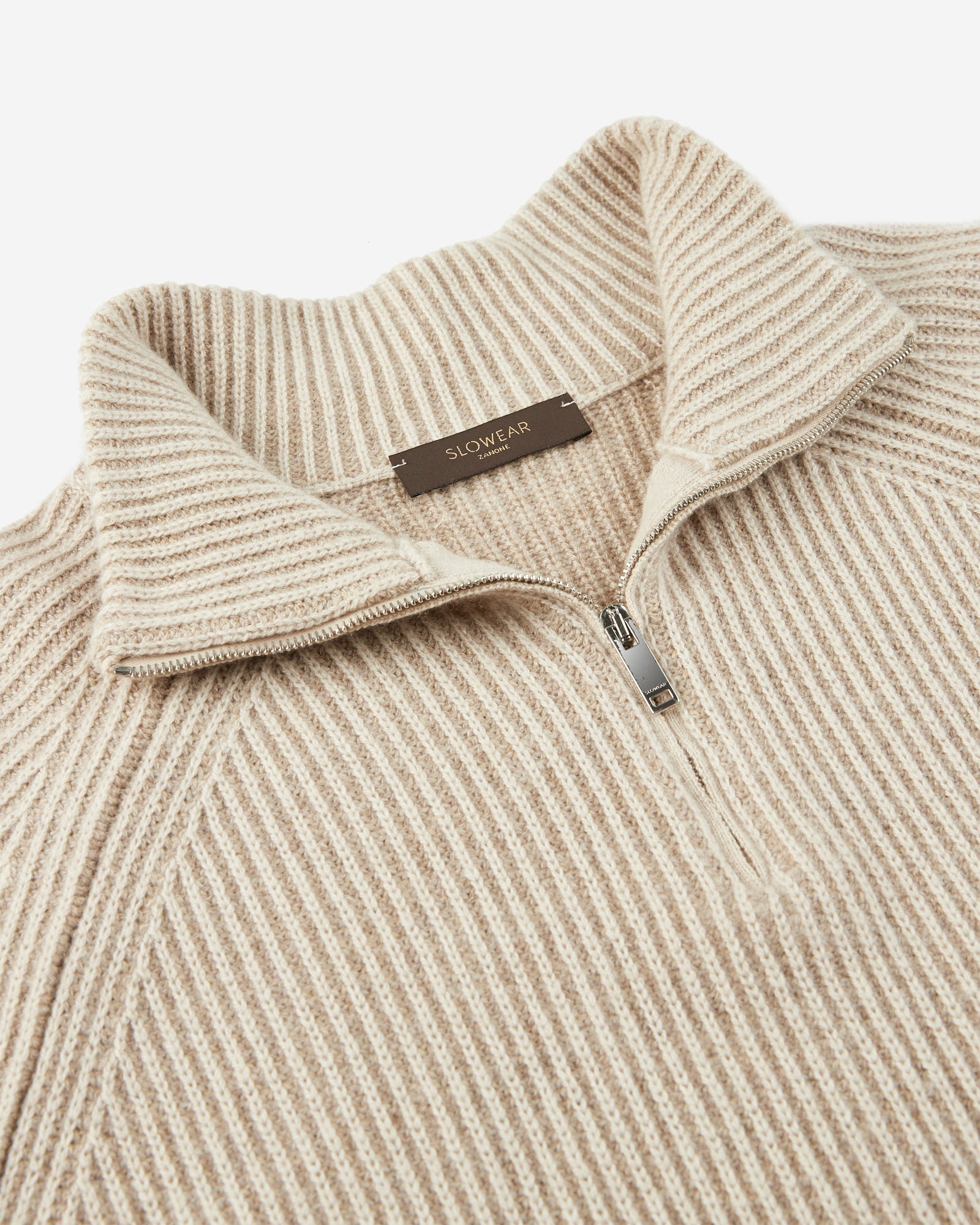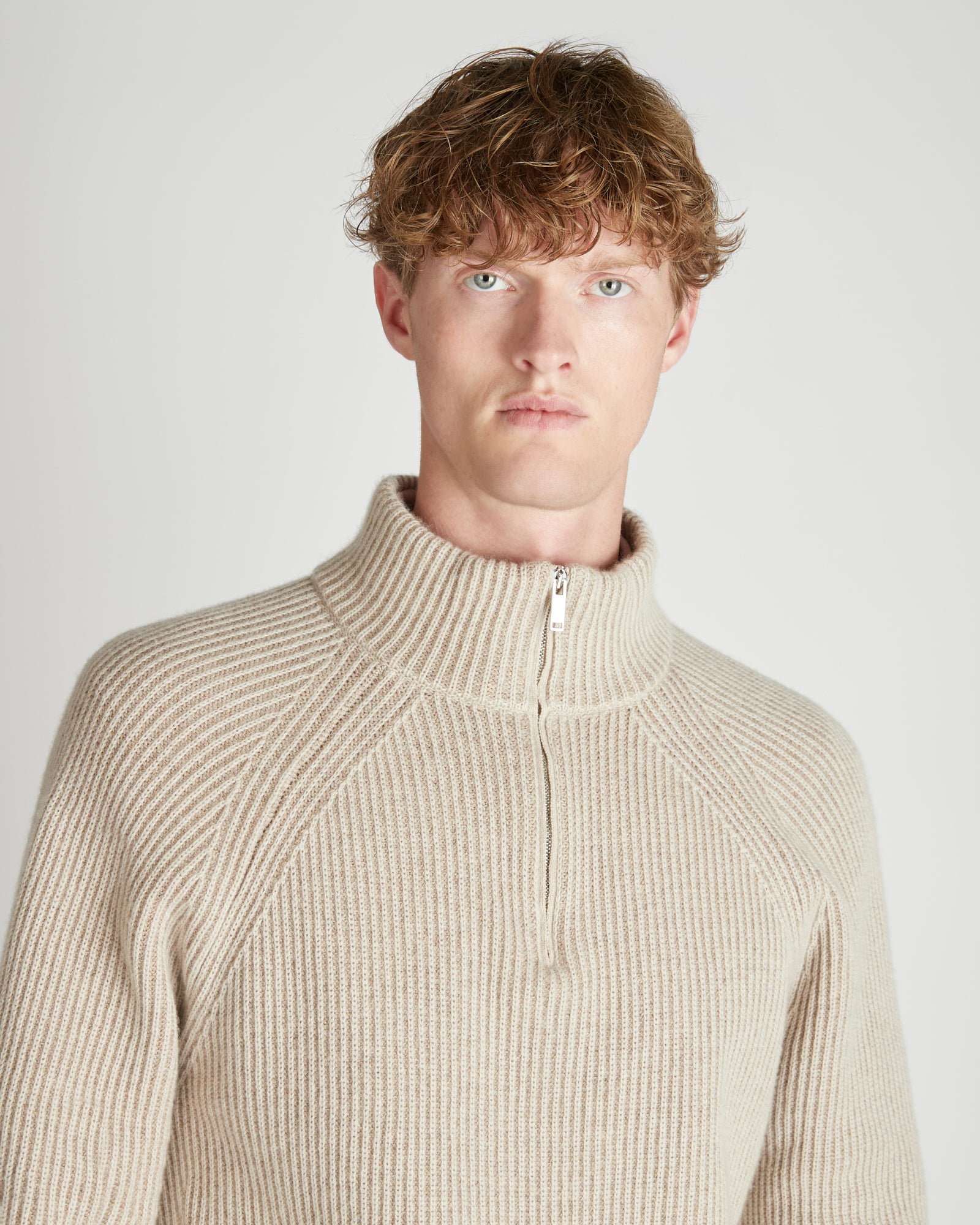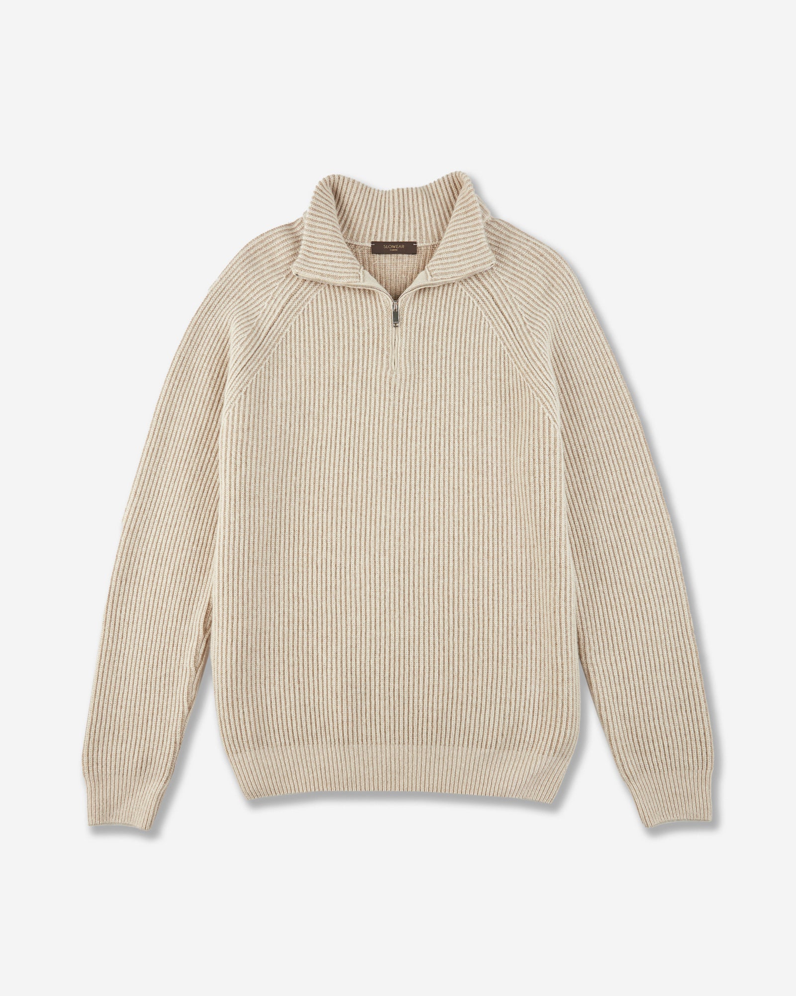 シンプルで洗練されたデザインが特徴のピュアカシミア100%のジップアップ・タートルネックは、快適性と柔らかさ、そしてスタイルを兼ね備えた長く愛用できるアイテムです。ラグランスリーブが流れるようなシルエットとスポーティーな印象を演出し、着心地の良さと自然な体の動きを強調します。イギリス式ハーフリブ編みが編地にも深みと個性を加え、厚みがありながら軽いテクスチャーが、カシミアのクオリティを際立たせます。