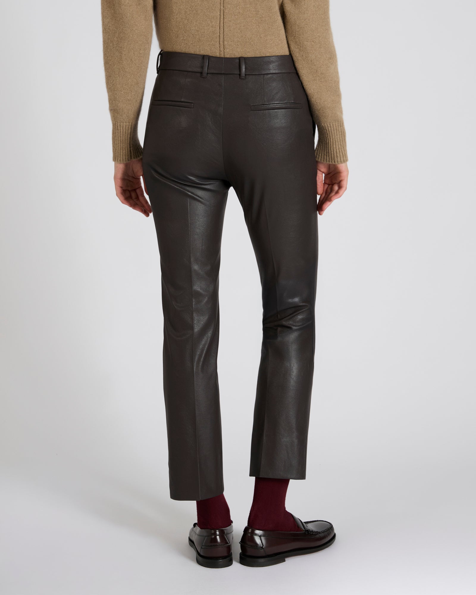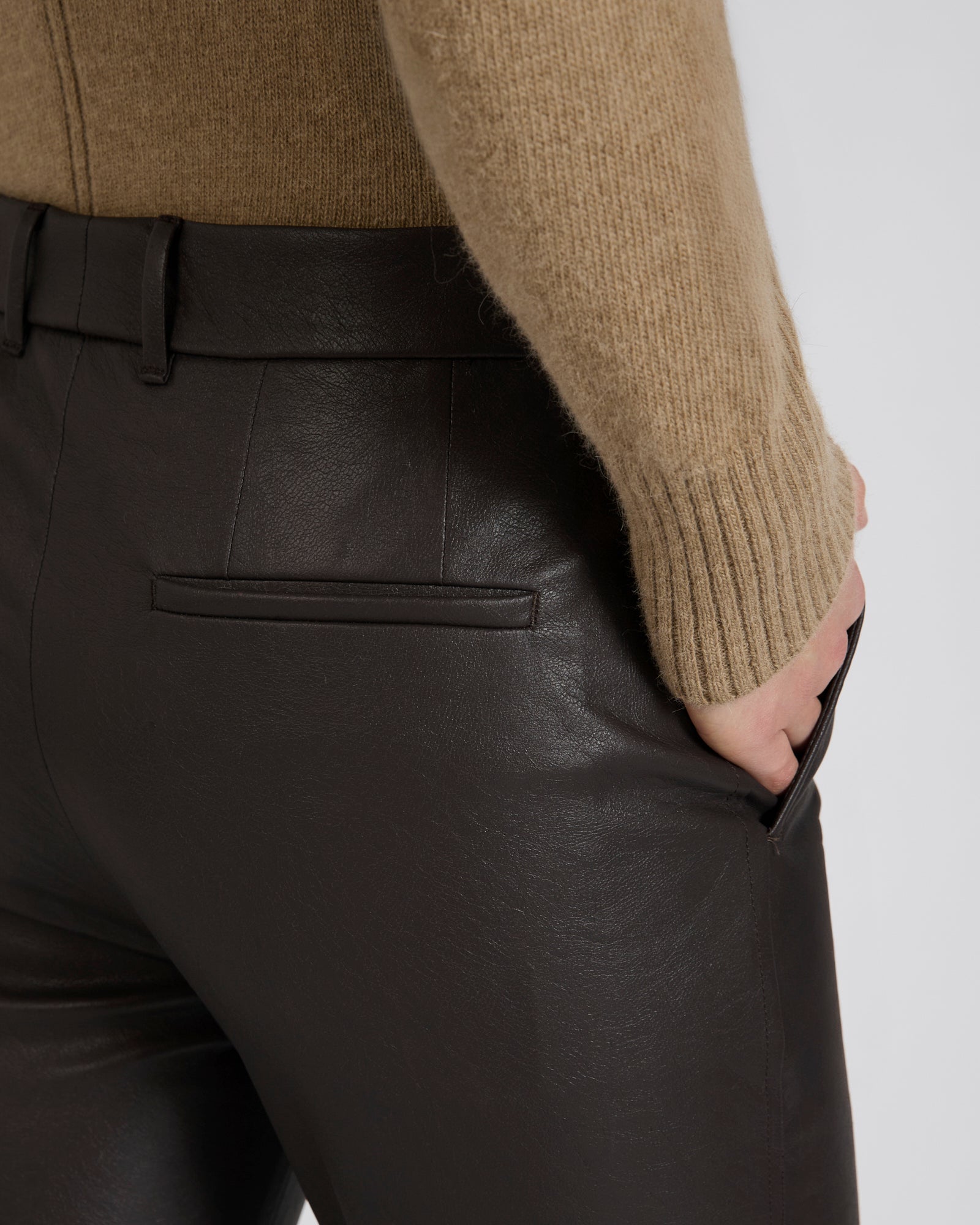 存在感がありコンテンポラリーな印象を持つパンツで、スリムフィットのすっきりとしたミニマルなラインにオリジナルのフェイクレザーを融合させています。ストレッチ性に加え、内側にはコットン裏地を施し、着用時の快適さと心地よさを最大限に追求しました。