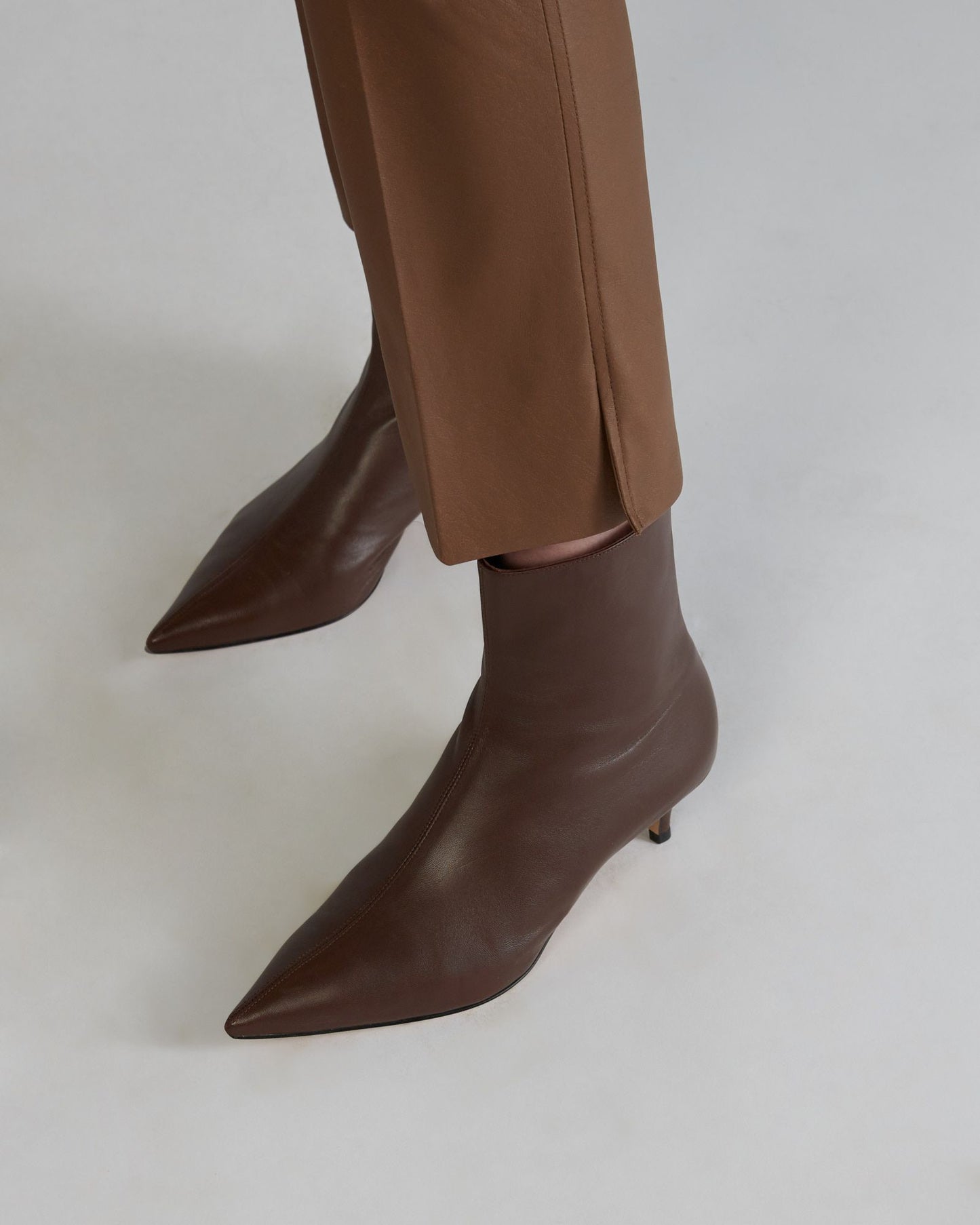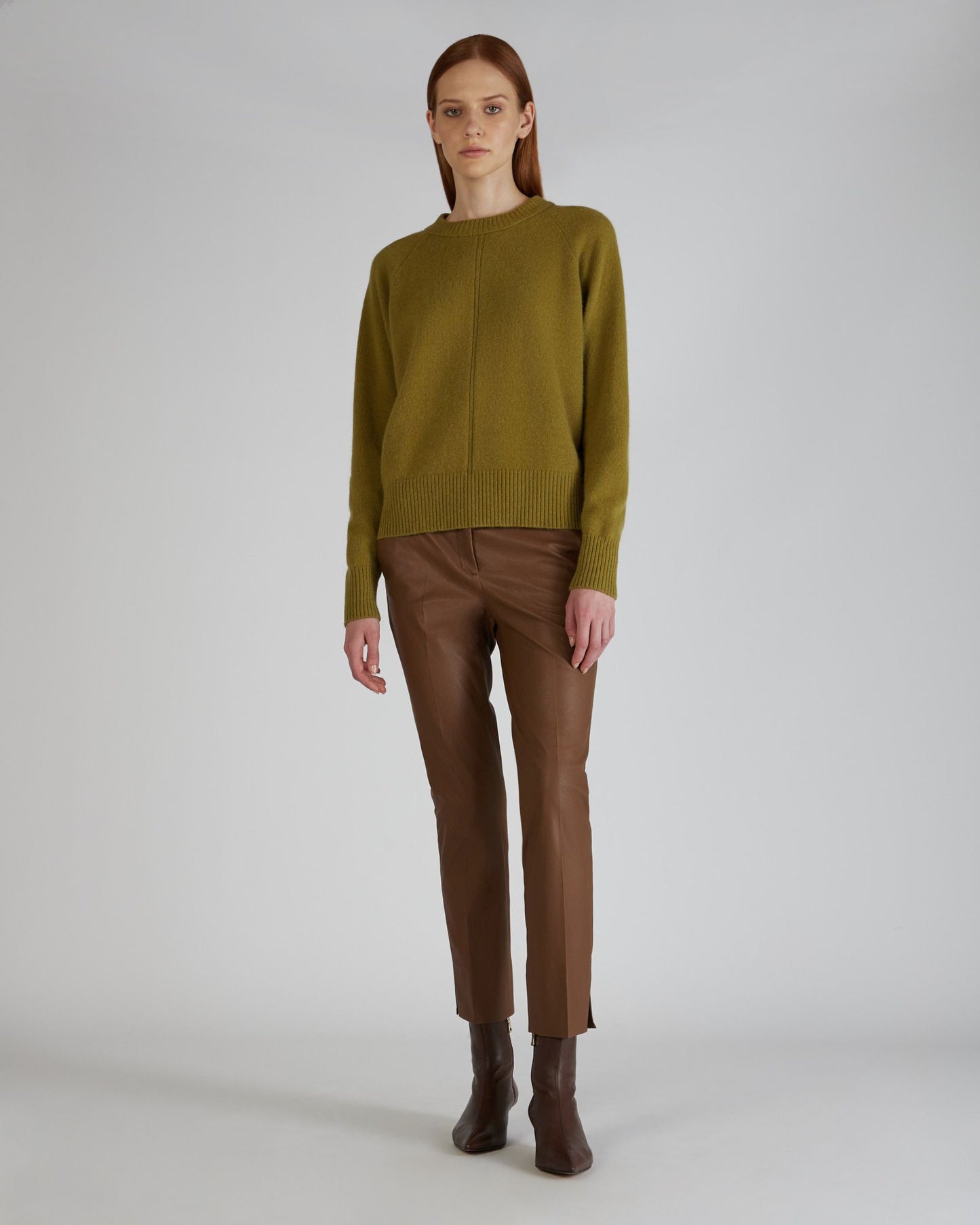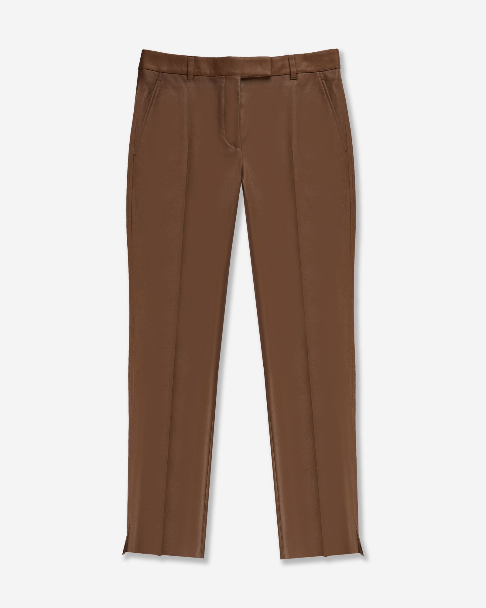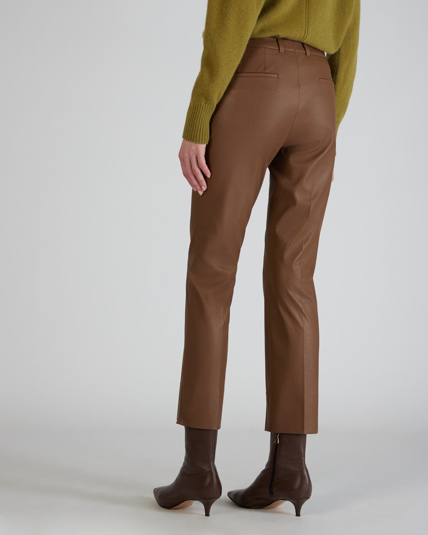 存在感がありコンテンポラリーな印象を持つパンツで、スリムフィットのすっきりとしたミニマルなラインにオリジナルのフェイクレザーを融合させています。ストレッチ性に加え、内側にはコットン裏地を施し、着用時の快適さと心地よさを最大限に追求しました。