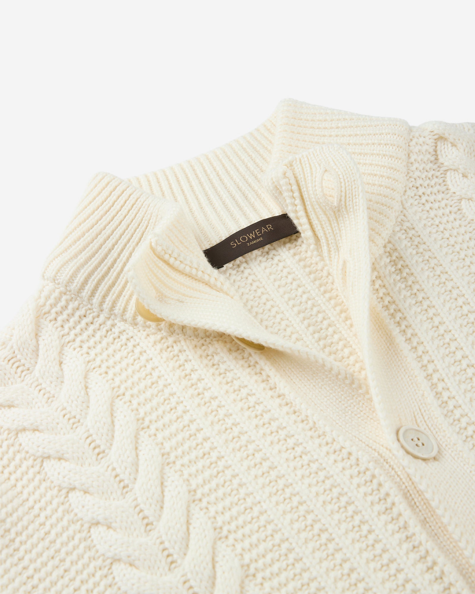 スタンドカラーカーディガンは、スローウェアのシグネチャーアイテムで、世界中のブランドファンから支持されています。首元まで続く特徴的なボタン留めが、真のアイコニックな要素となっています。人と環境の安全を生産の全てのプロセスにおいて保証していることが認証された柔らかく暖かいウールで仕上げました。