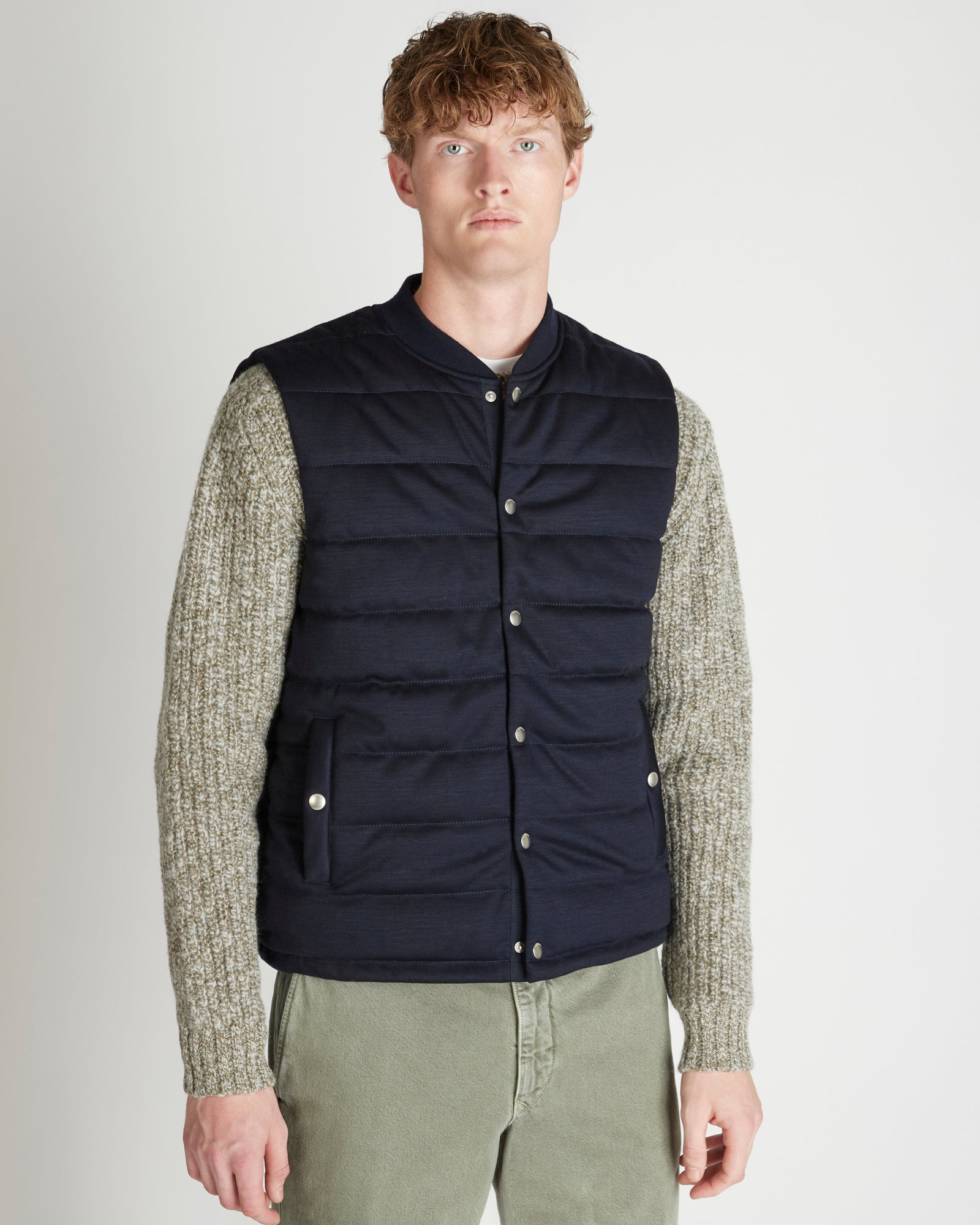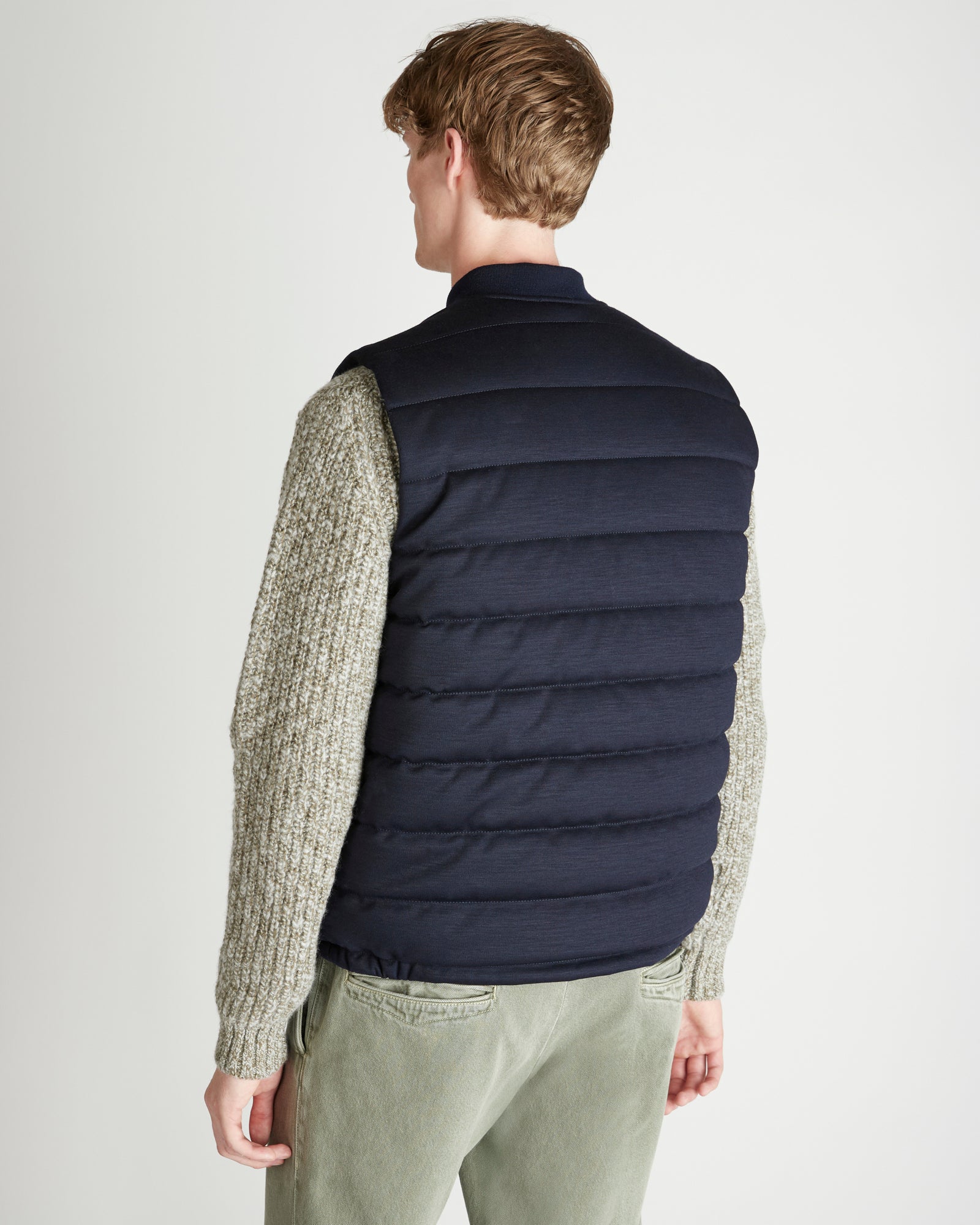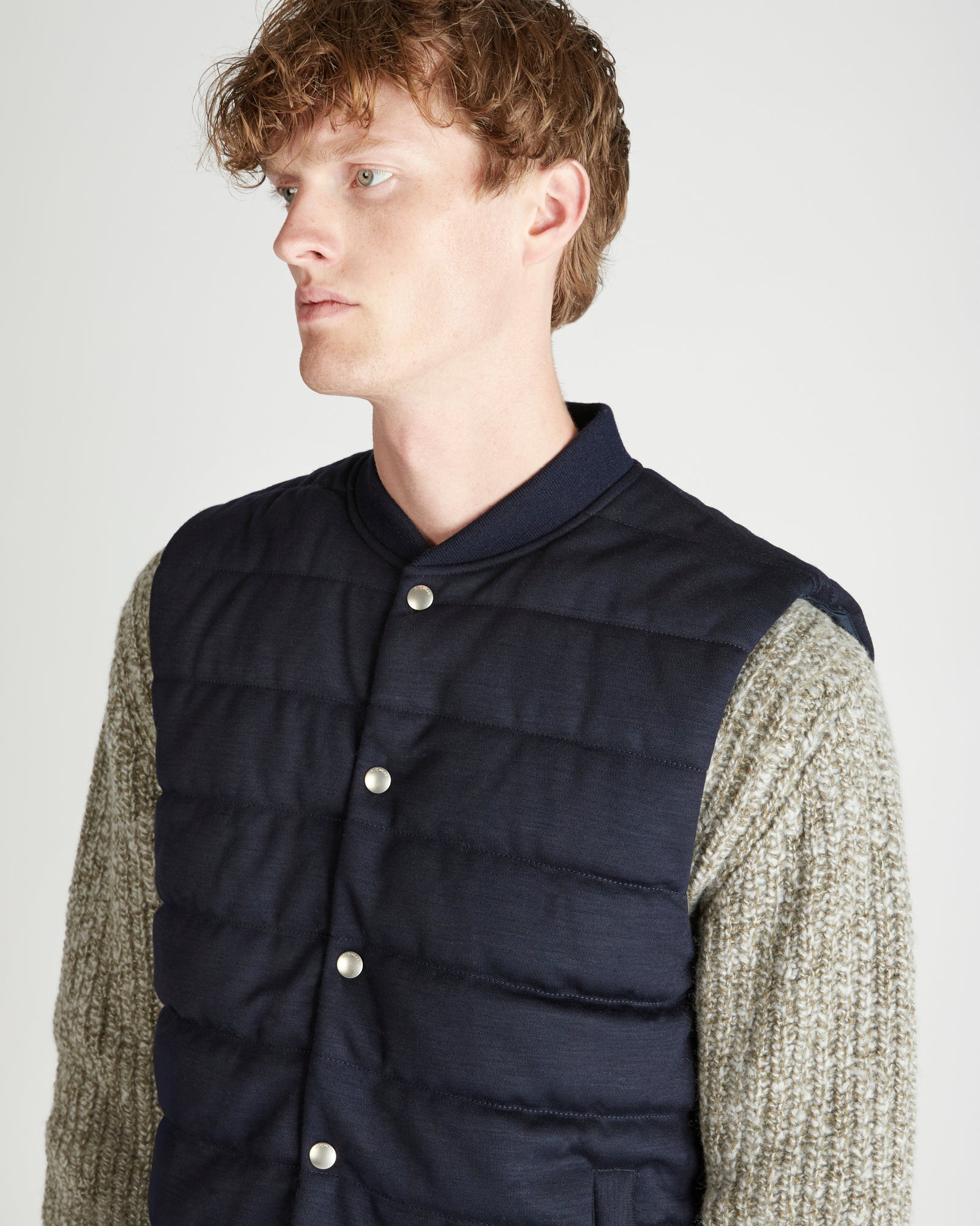 機能性とスタイルを兼ね備えた、高品質なハイブリッドアイテム。このベストはリバーシブル構造で、片面は柔らかく暖かいウール素材の表地、もう片面は高性能なテクニカルファブリックを使っています。内側には軽いコットンパッドがあり、さらに暖かさと保温性を高めています。多様なシーンやコーディネートに対応できる汎用性の高さから、アウターとニットのハイブリッドアイテムとして、シーズン・ワードローブのマストアイテムです。