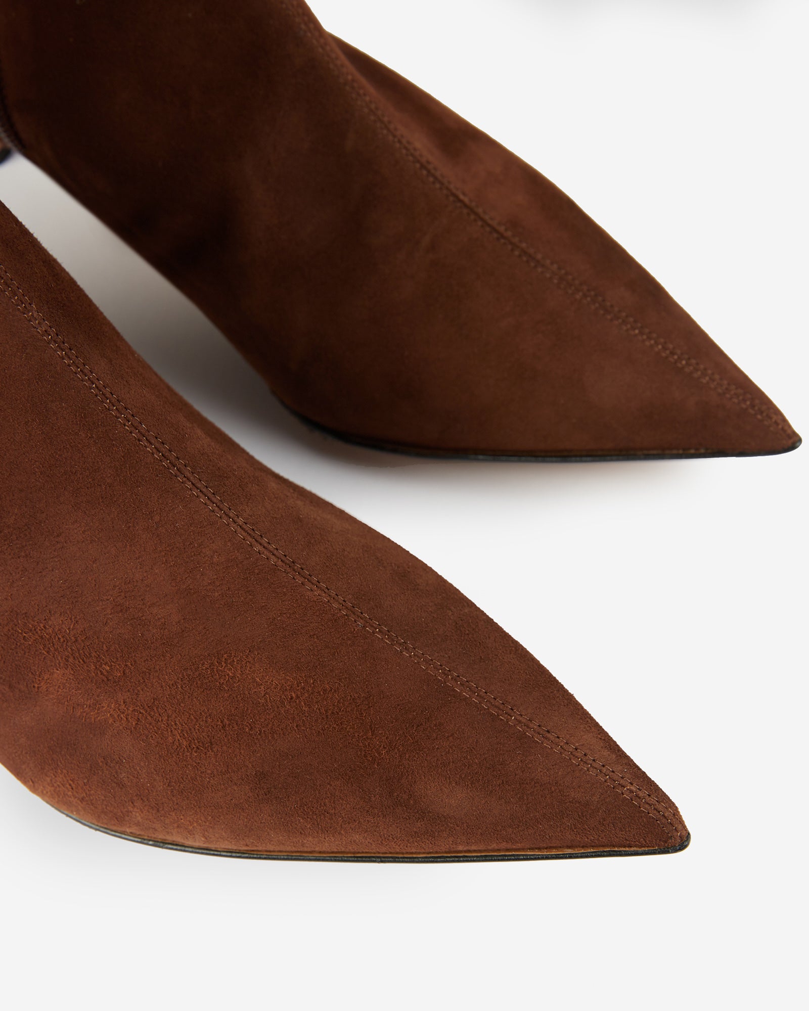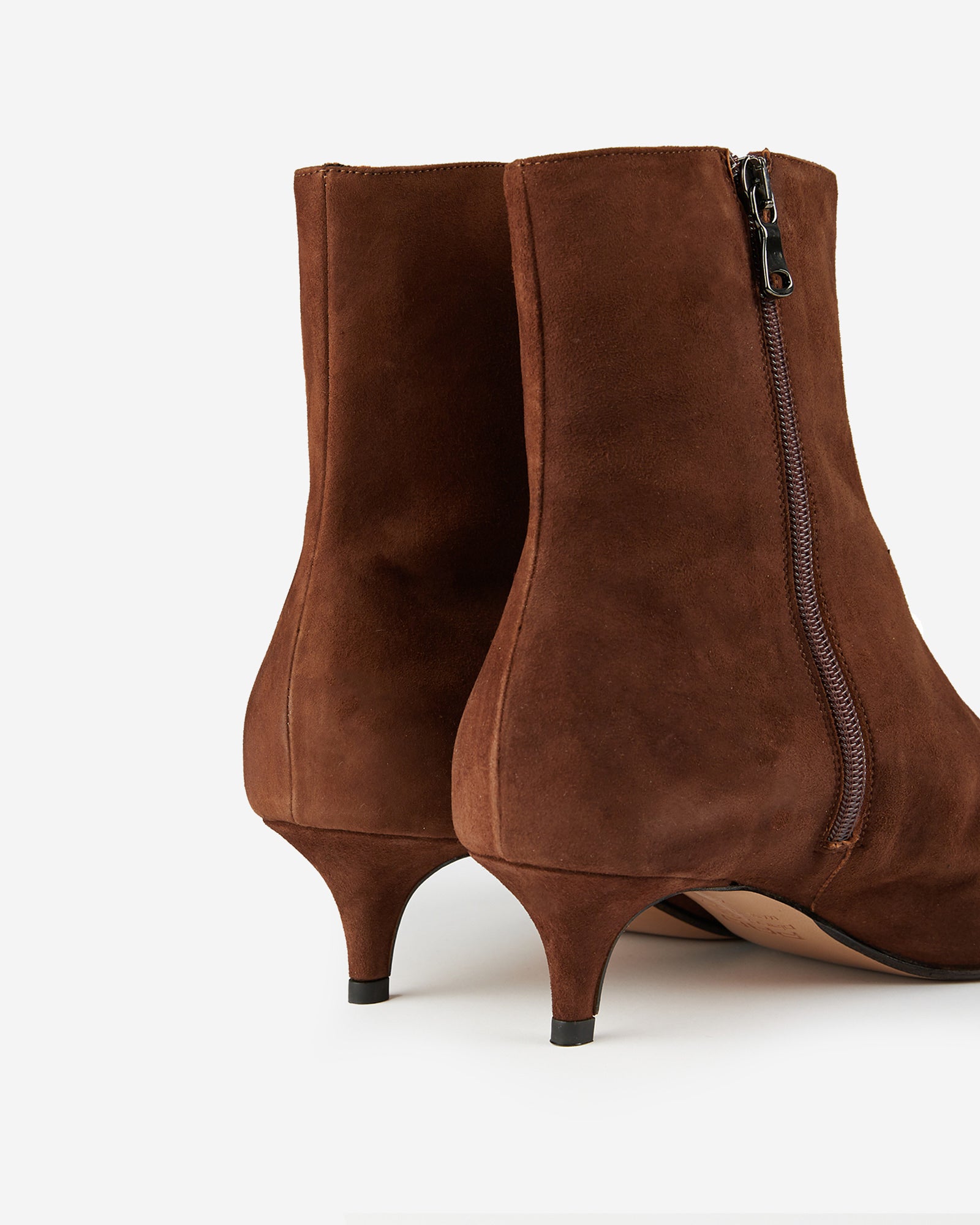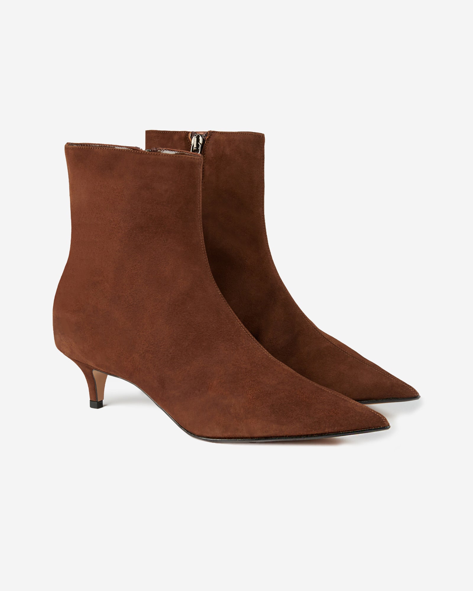ショートブーツは汎用性が高くスタイリッシュで、よりエレガントな装いを完成させるために最適で、カジュアルスタイルに力強さをプラスします。柔らかいスエードレザーで作り、ミディアムからローのヒールが長時間の着用にも最適です。やや細長いトゥがシューズのデザインにさらなる個性を与えています。