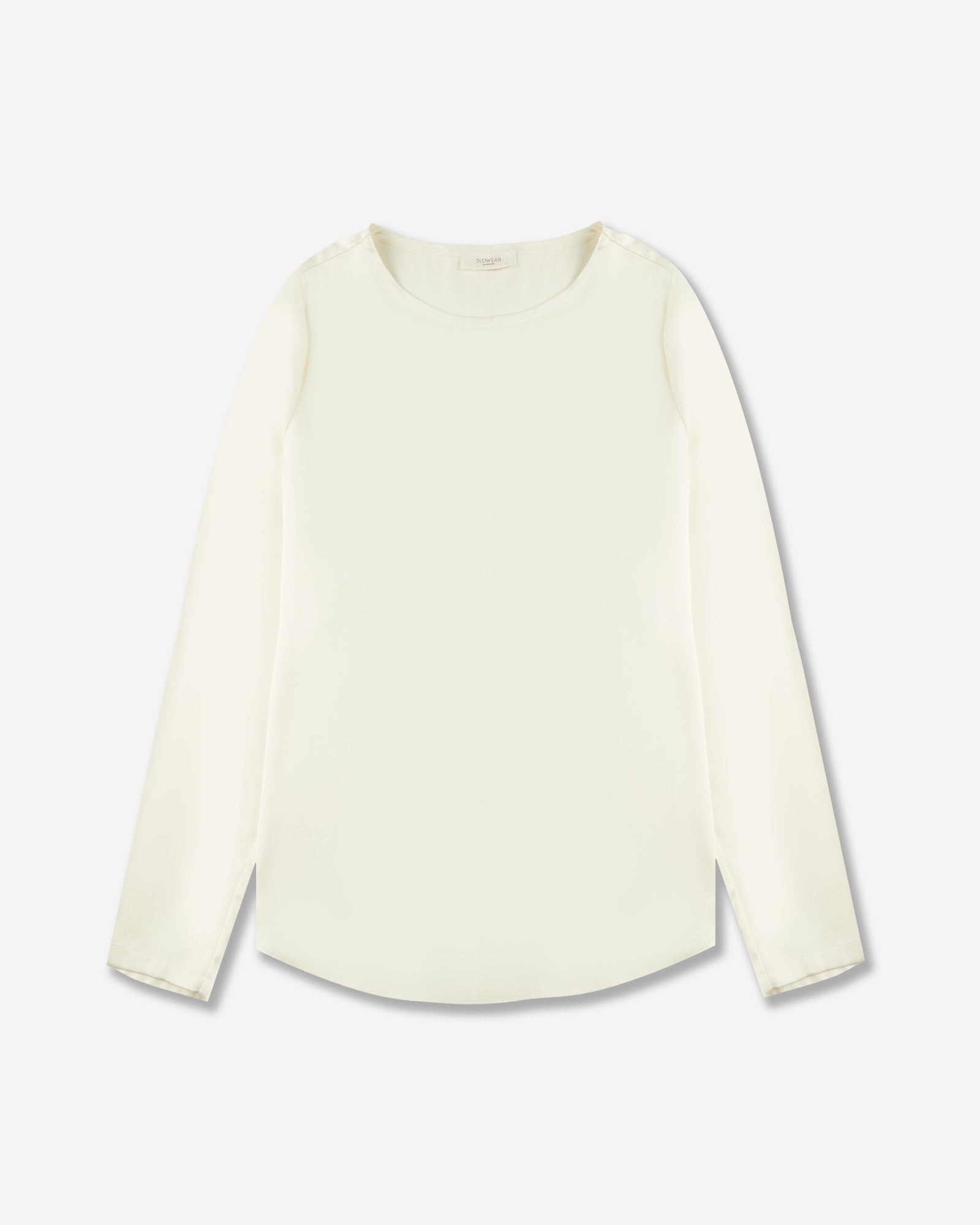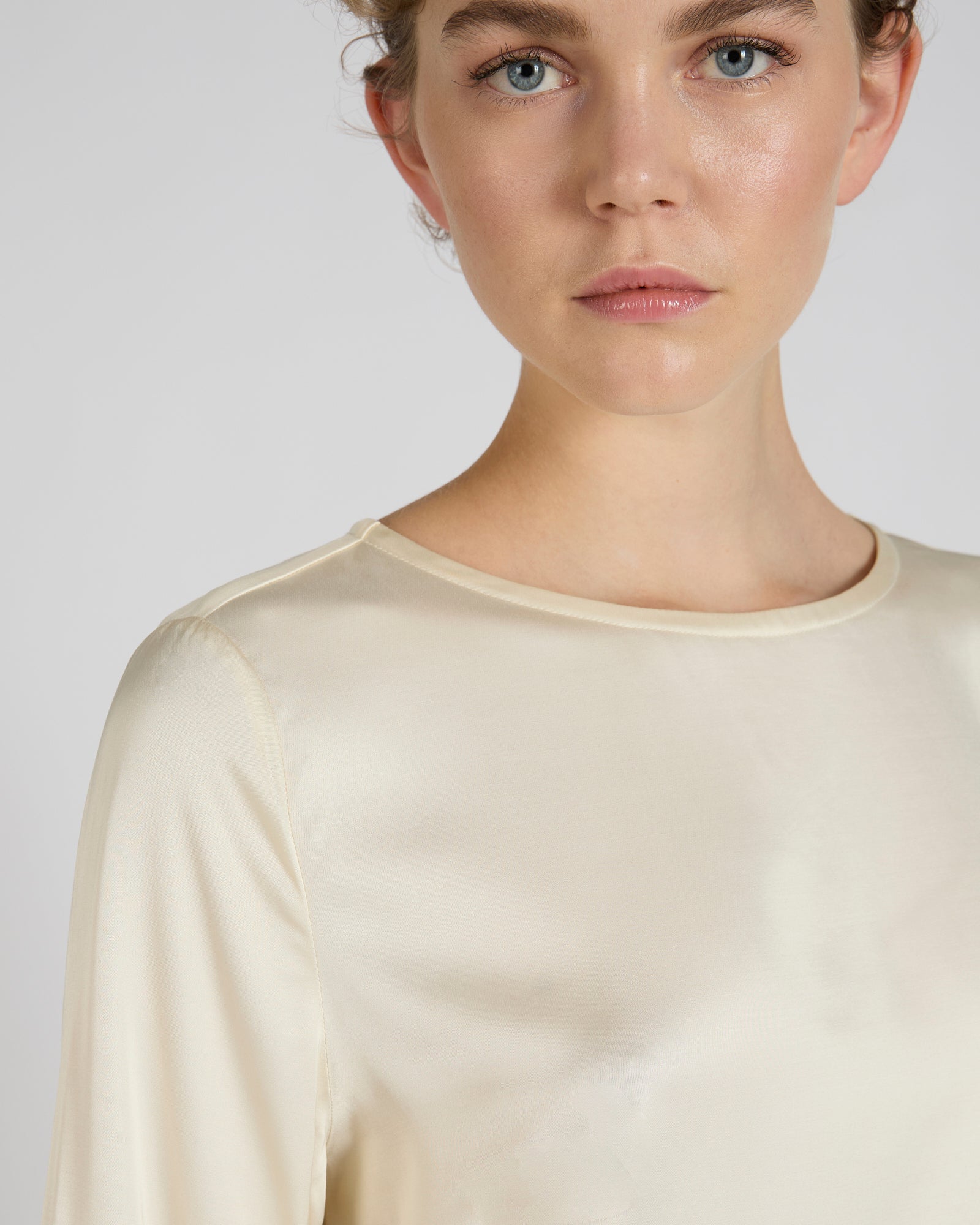 なめらかで光沢のある質感、そして洗練されたスタイル。このシャツはクルーネック仕立てで、ワイドフィットならではのゆったりとしたシルエットと、艶やかなサテン生地の軽やかさを兼ね備えています。シーズンのあらゆるコーディネートに上品な個性を添える、洗練された一着です。