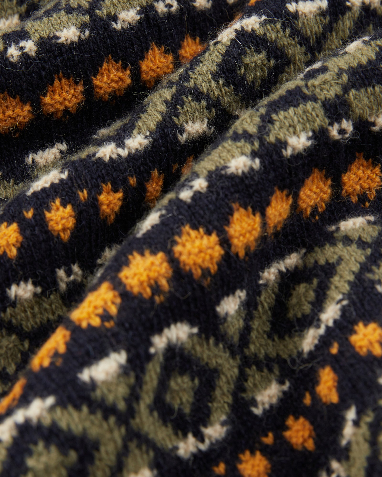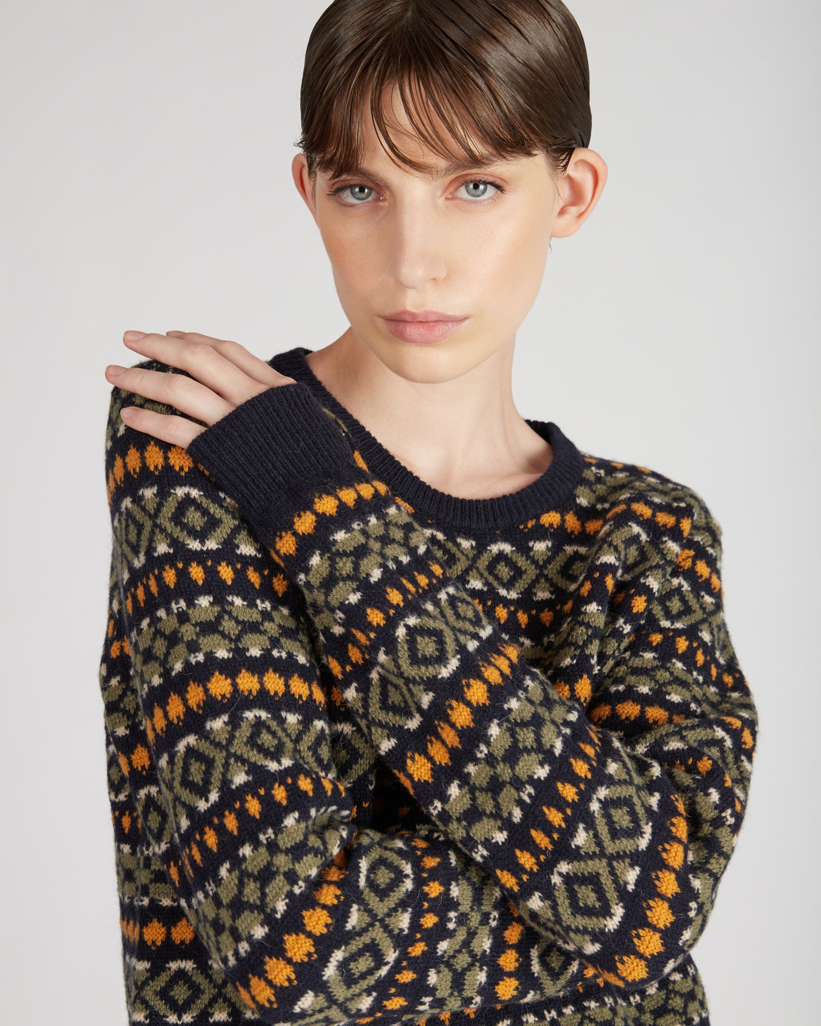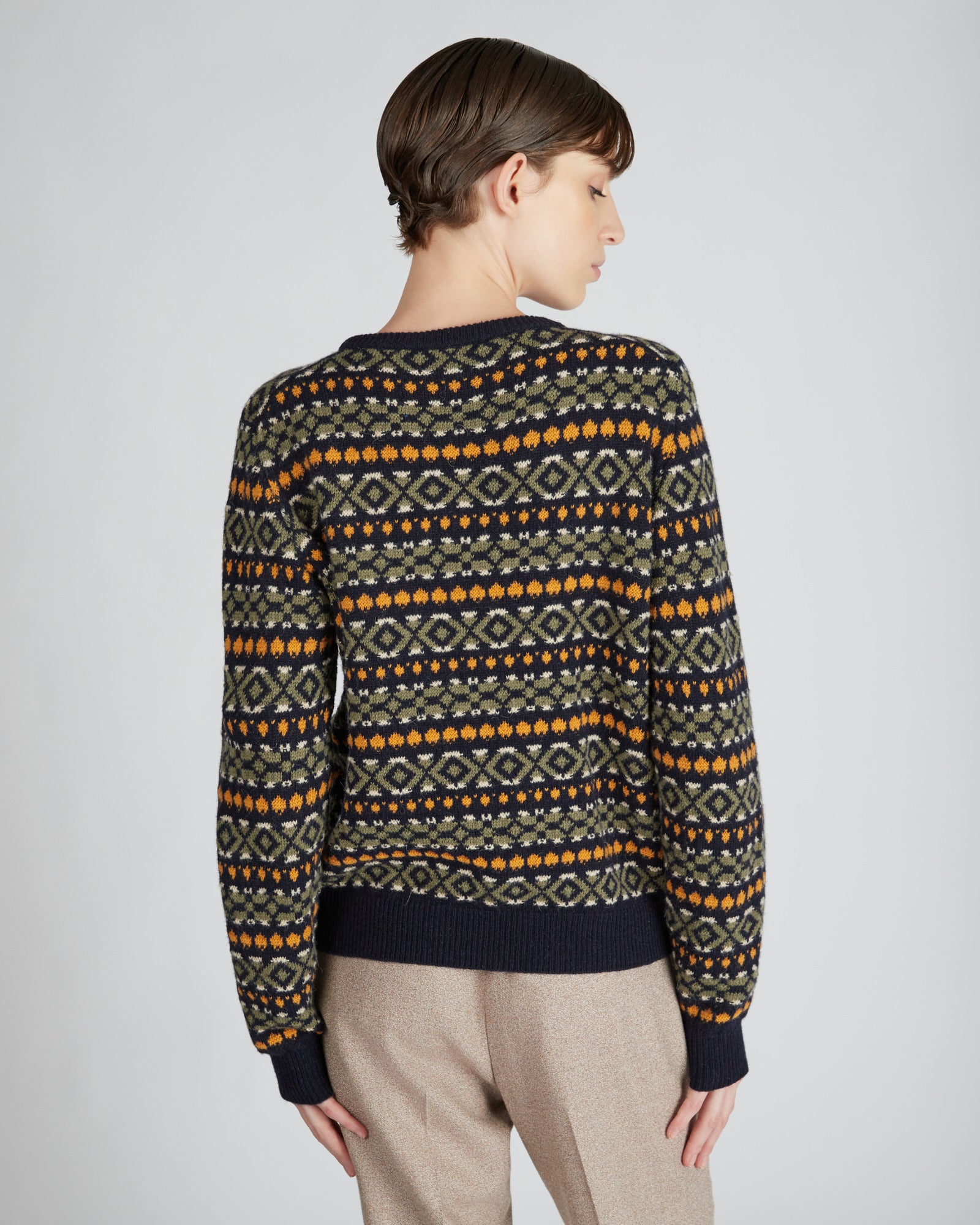 This sweater is made of pure virgin wool and Alpaca, an extremely durable, warm and soft wool. The jacquard workmanship, executed with great precision, allows for the creation of complex and refined patterns, enhancing the quality of the yarn and giving this garment a strong stylistic identity. The result is a sweater that speaks of tradition and innovation, ideal for those looking for elegance and authenticity in every detail.