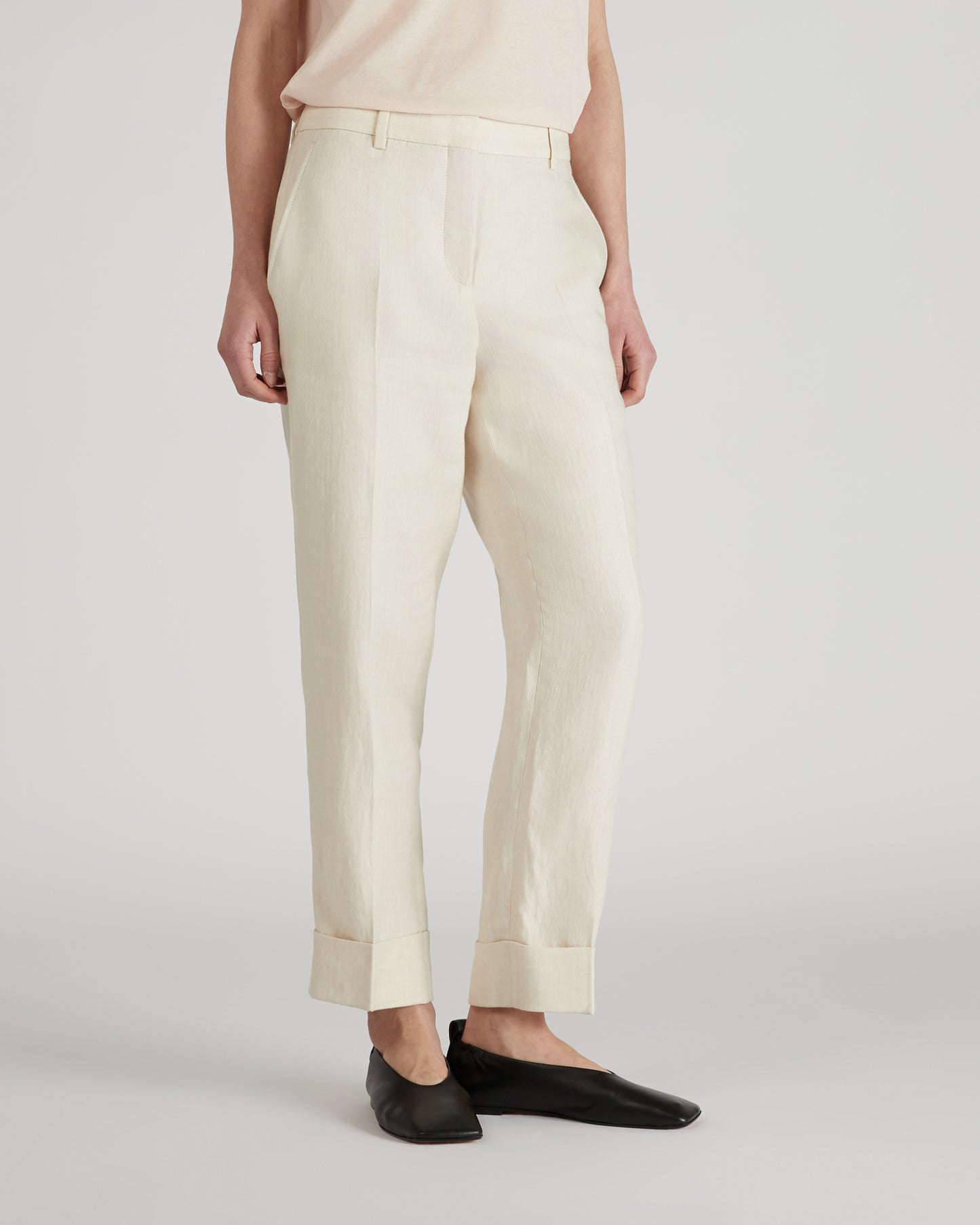 Linen is one of the world's oldest textile fibres. Centuries of innovation and research have consolidated its prominent role in women's dress. Much favoured for its subtly iridescent appearance, it is lightweight yet resilient and extremely pleasant to wear throughout the day. Here it is proposed on a regular fit model that is straight along the leg.