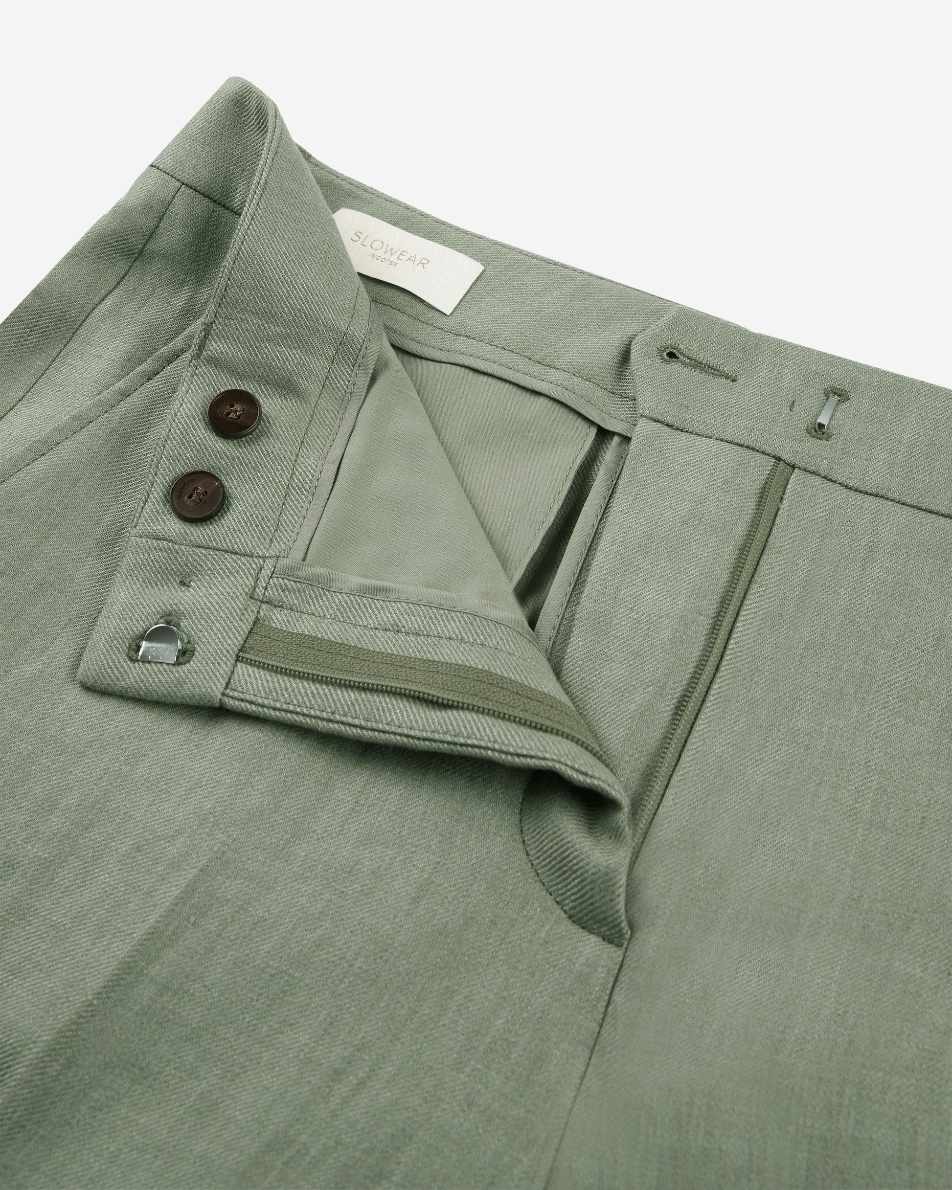 Linen is one of the world's oldest textile fibres. Centuries of innovation and research have consolidated its prominent role in women's dress. Much favoured for its subtly iridescent appearance, it is lightweight yet resilient and extremely pleasant to wear throughout the day. Here it is proposed on a regular fit model that is straight along the leg.