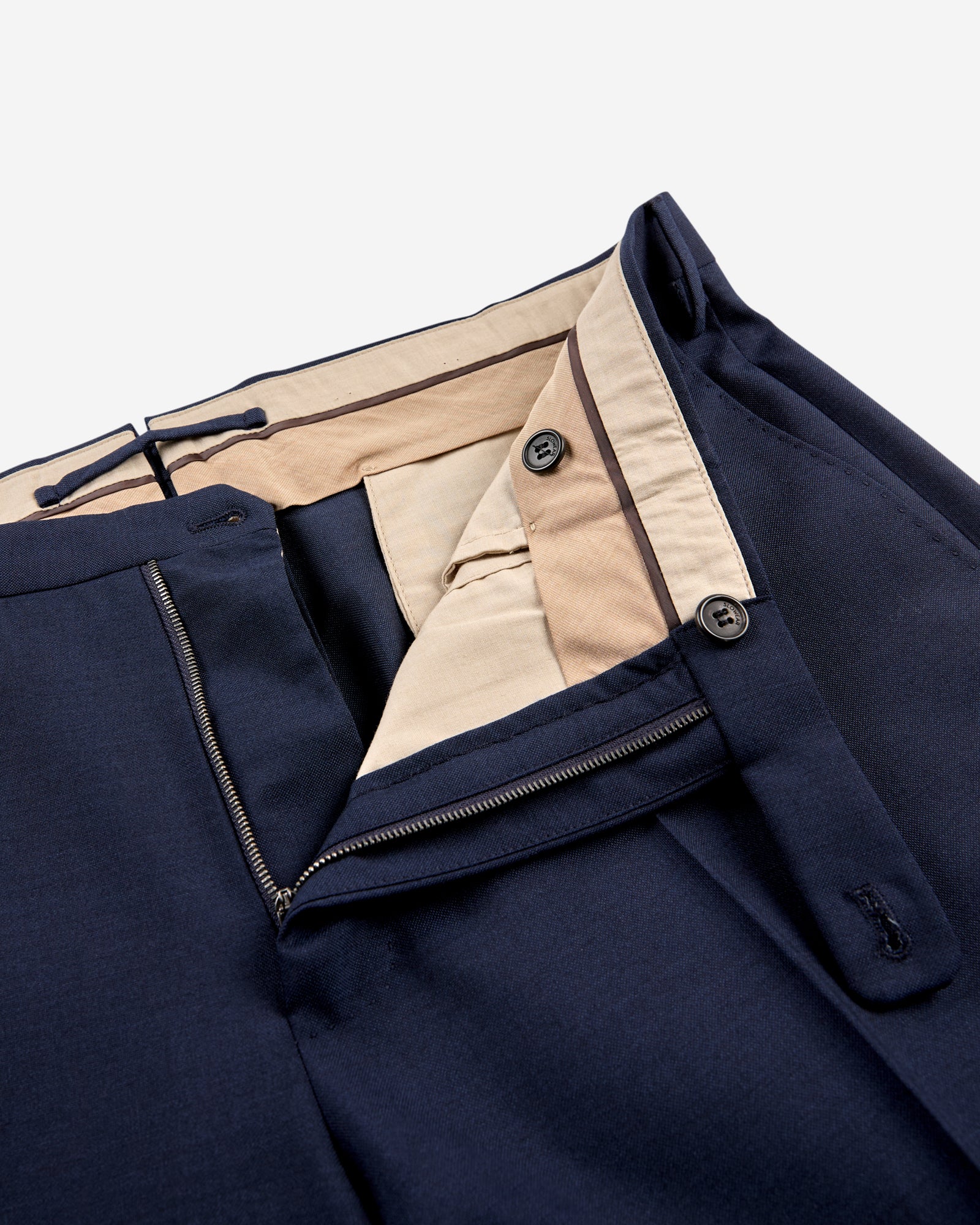 • The trousers feature a self-locking zip, belt extension with internal button, front slash pockets, coin pocket on the belt, and double-welt back pockets.
