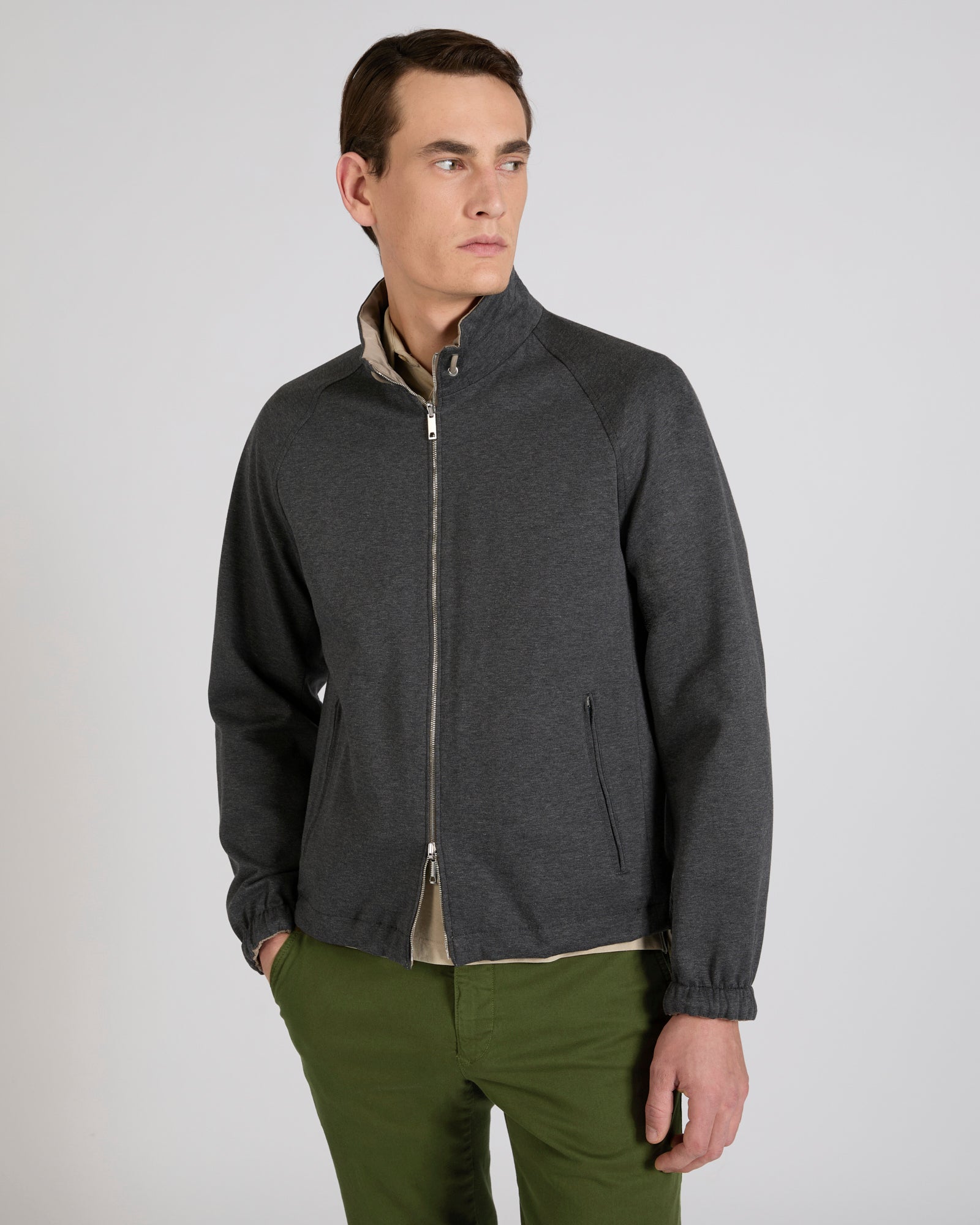 A dynamic, refined and highly functional model, this outerwear garment is completely reversible. On one side, a polyester taffeta provides protection when you're more exposed to cold and wind. The other side, in mélange jersey, is an excellent alternative on occasions when you want a more refined yet casual garment. The skilful construction of the zip, the pockets, the bottom of the garment and the seams means that there is no difference between one side and the other, making them both impeccable.