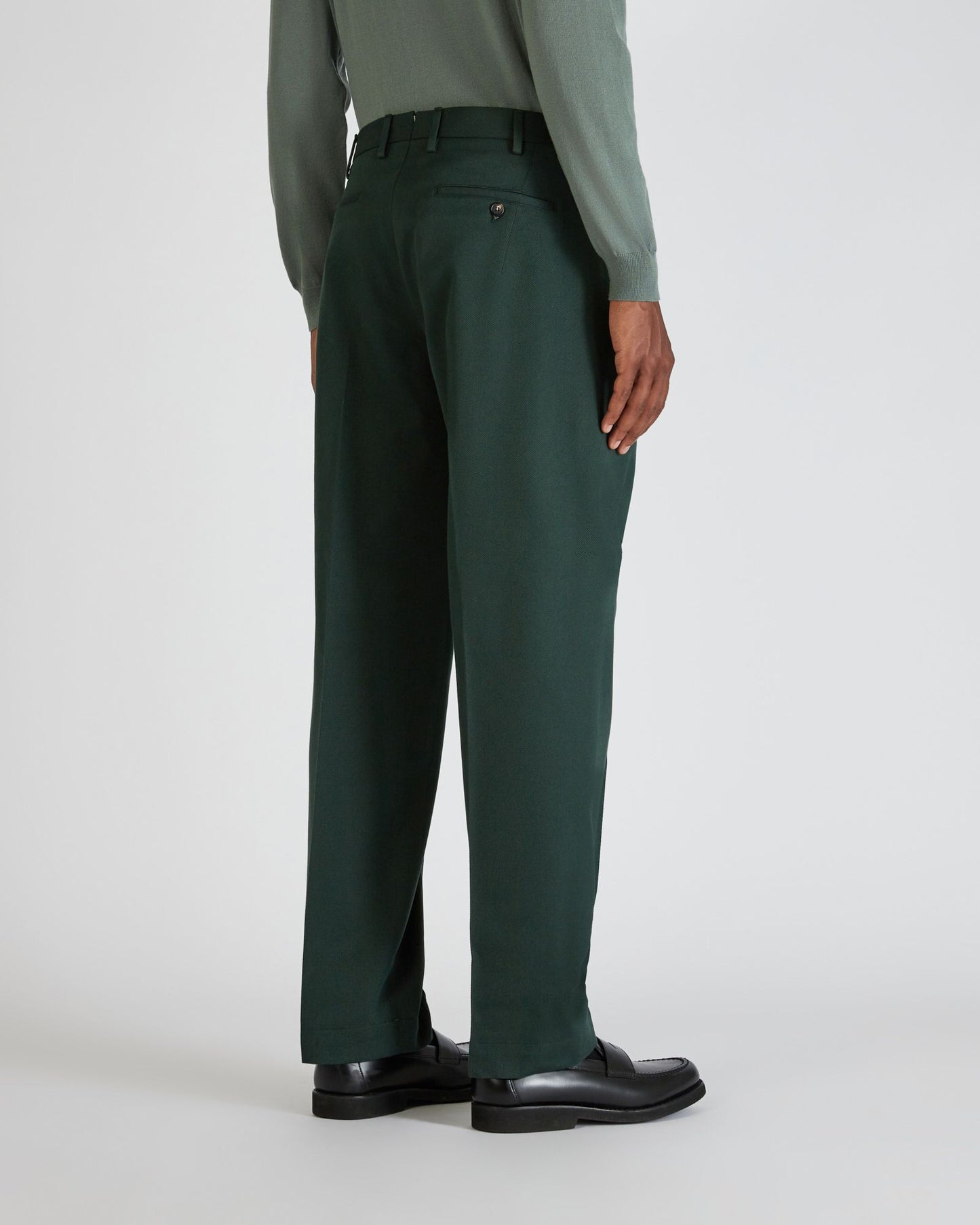 - The trousers have front welt pockets, a front crease and buttoned back welt pockets.