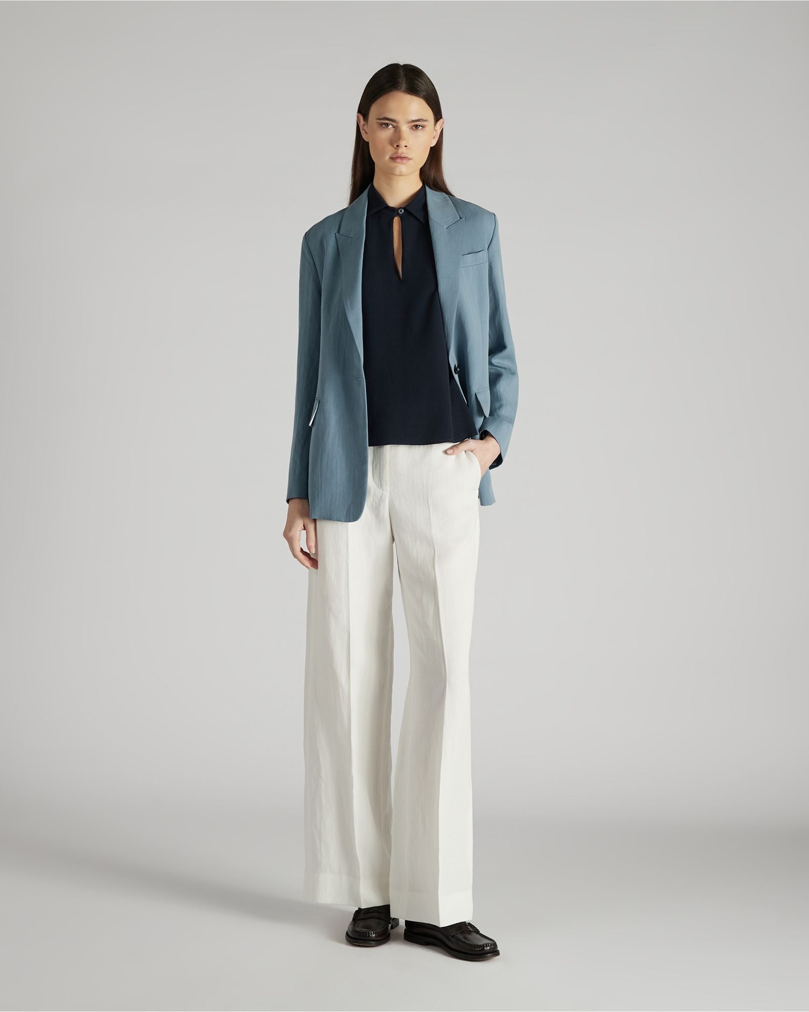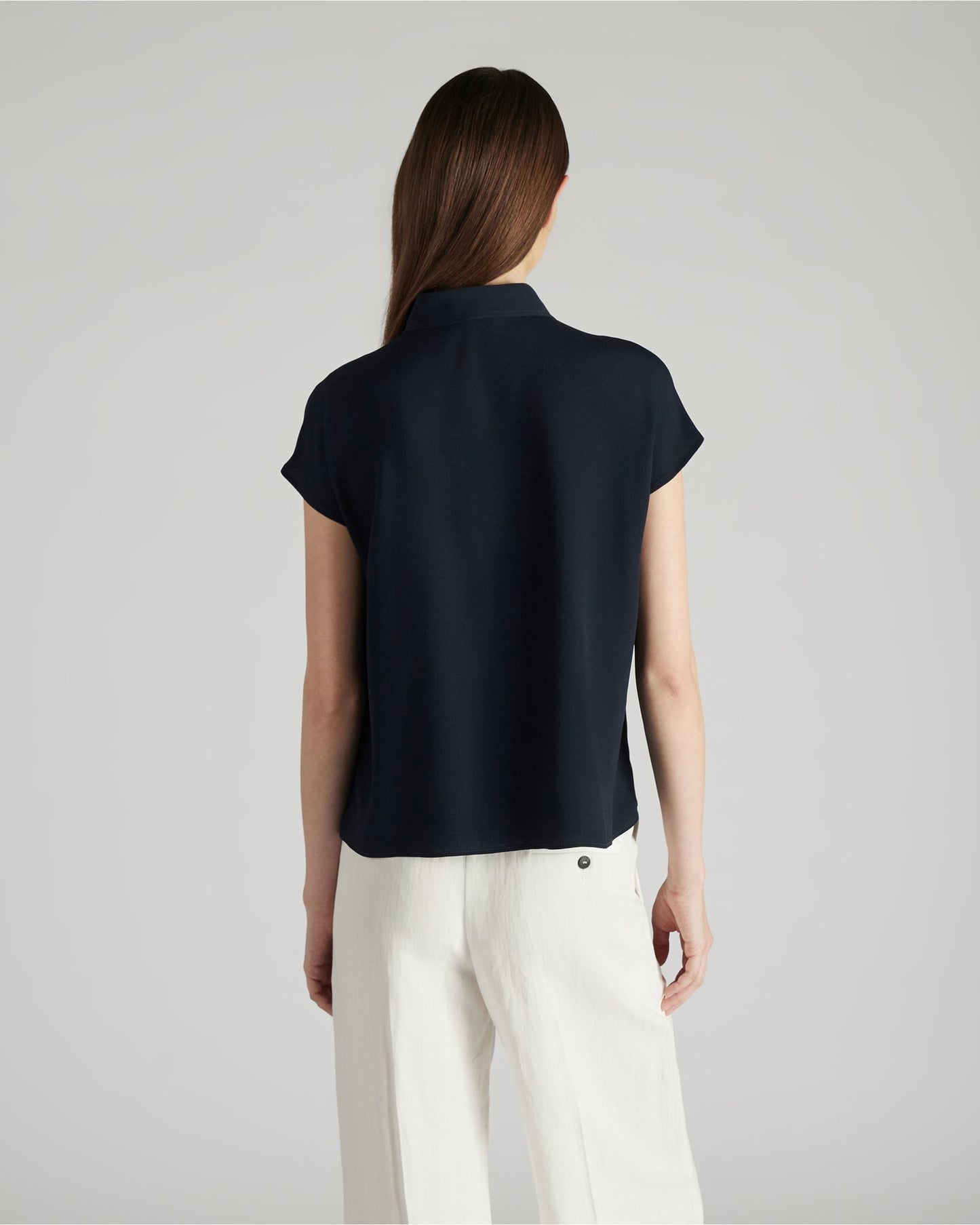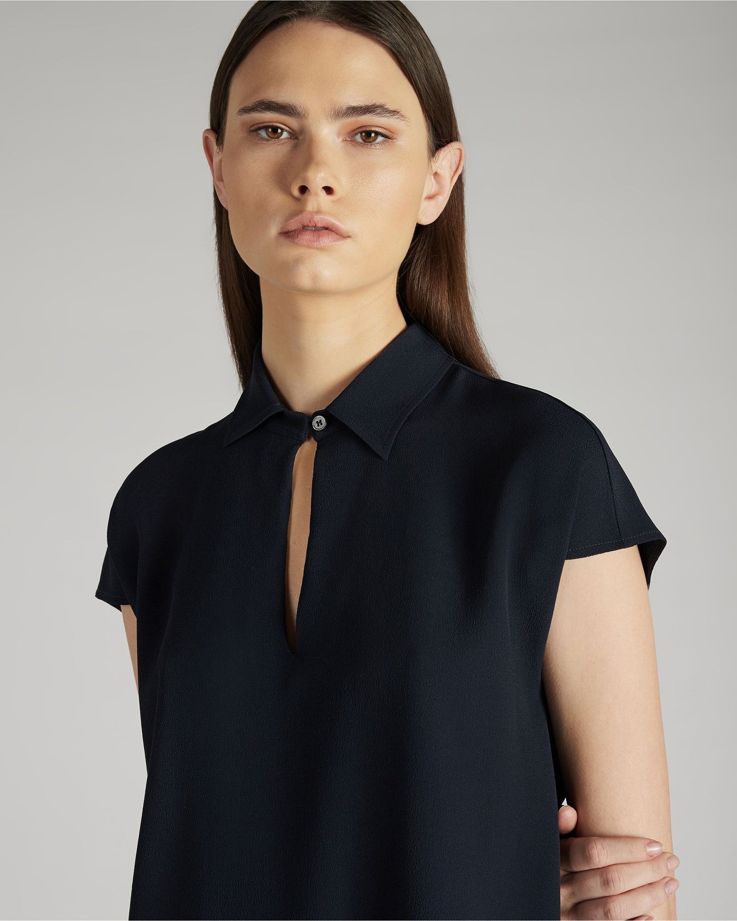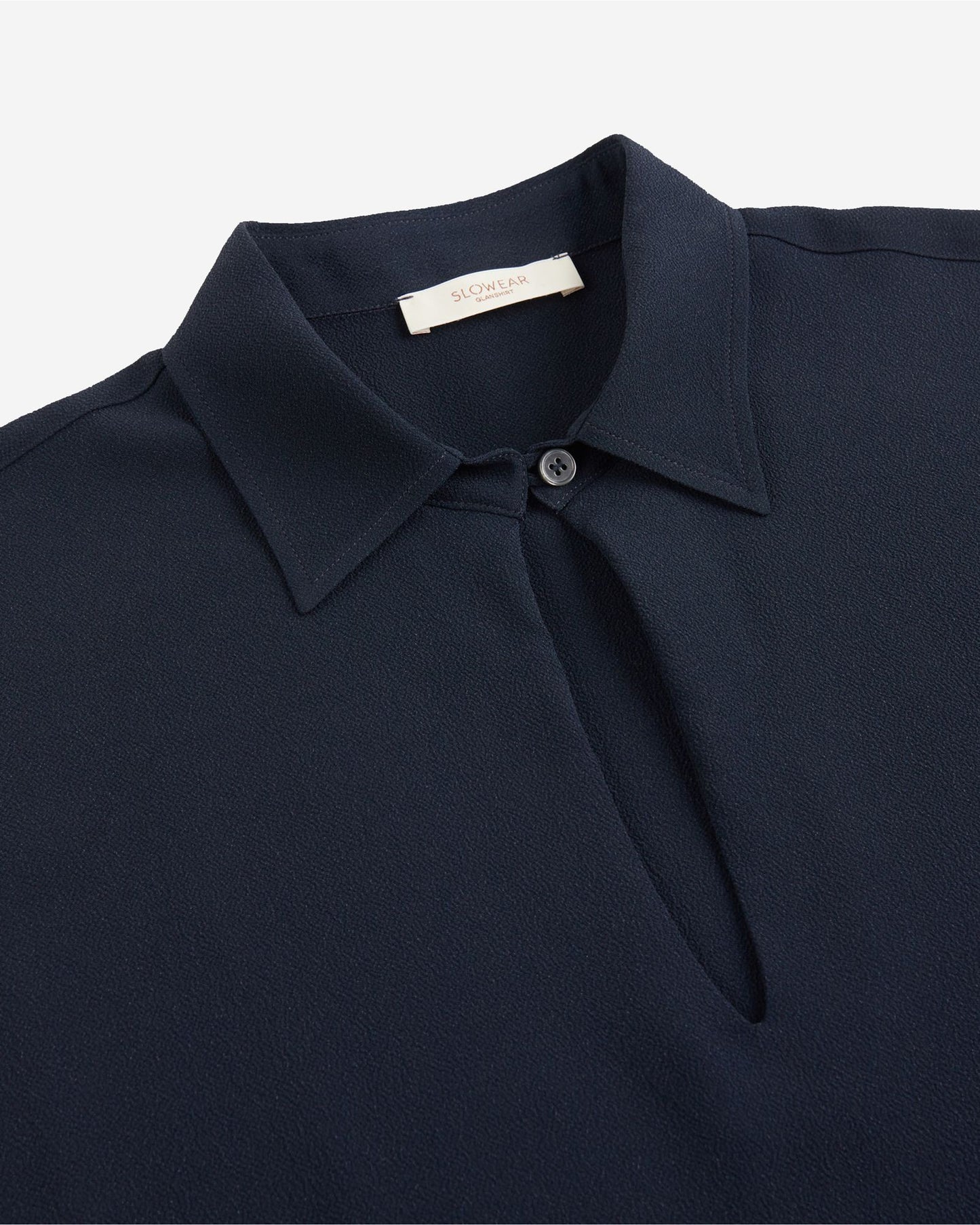 An elegant and sophisticated piece, this shirt has a perfect combination of fabric, fit and tailoring details. The silk-blend crepe-de-chine gives it a soft yet firm feel and a smooth appearance. The fit creates an interplay of volumes with the natural silhouette. Details, such as the buttoned neckline, emphasise the garment's elegance. Team the blouse with trousers in the same fabric.