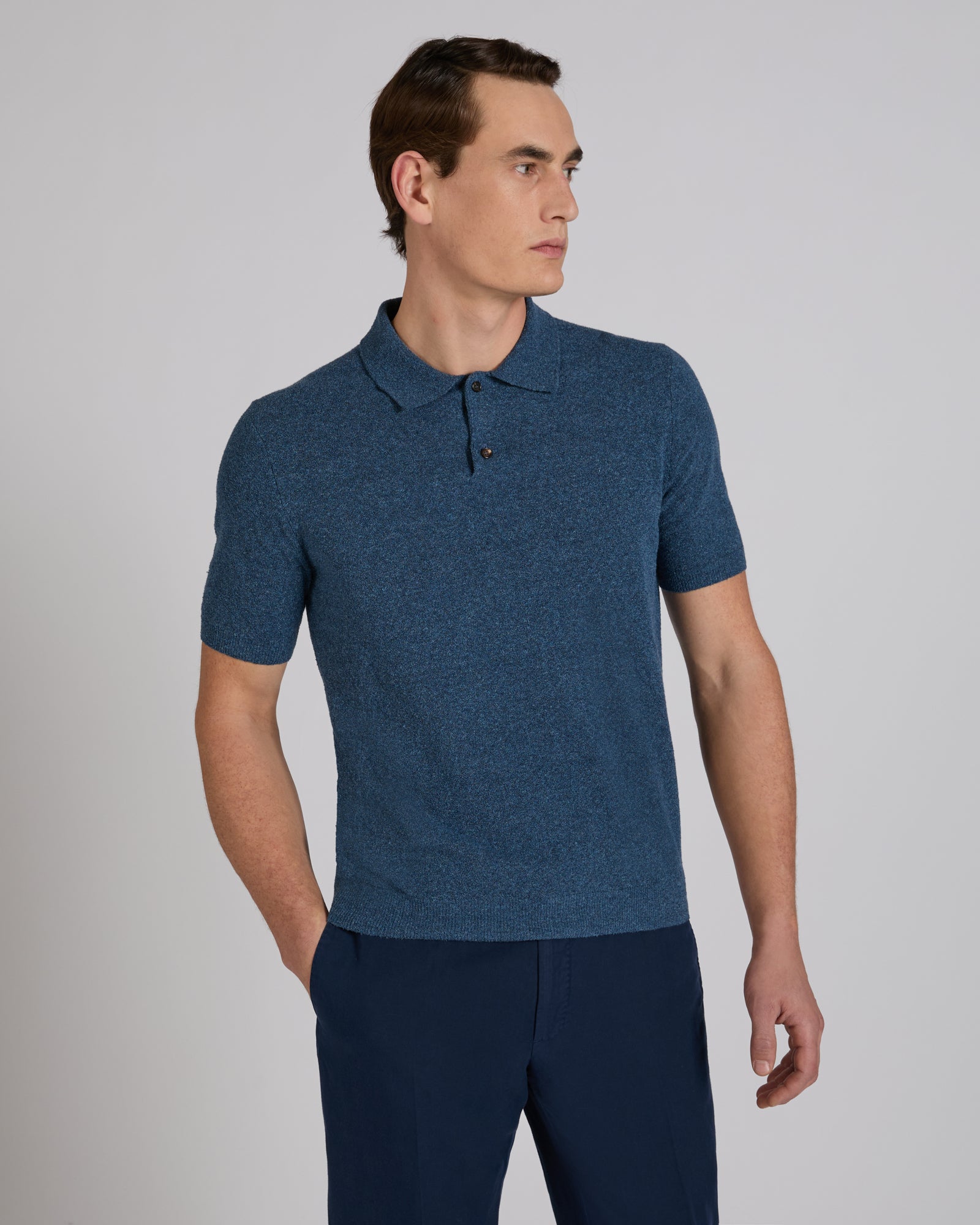 This slim-fit polo shirt revisits a wardrobe classic with a textured, contemporary twist. It is made of cotton bouclé, a type of weave featuring small loops and knots that create an uneven, three-dimensional surface. This particular effect adds depth to the garment, making it soft to the touch and a distinctive look. The fabric is a soft cotton that is produced through a certified process that ensures worker safety and respect for the environment at all stages of production.