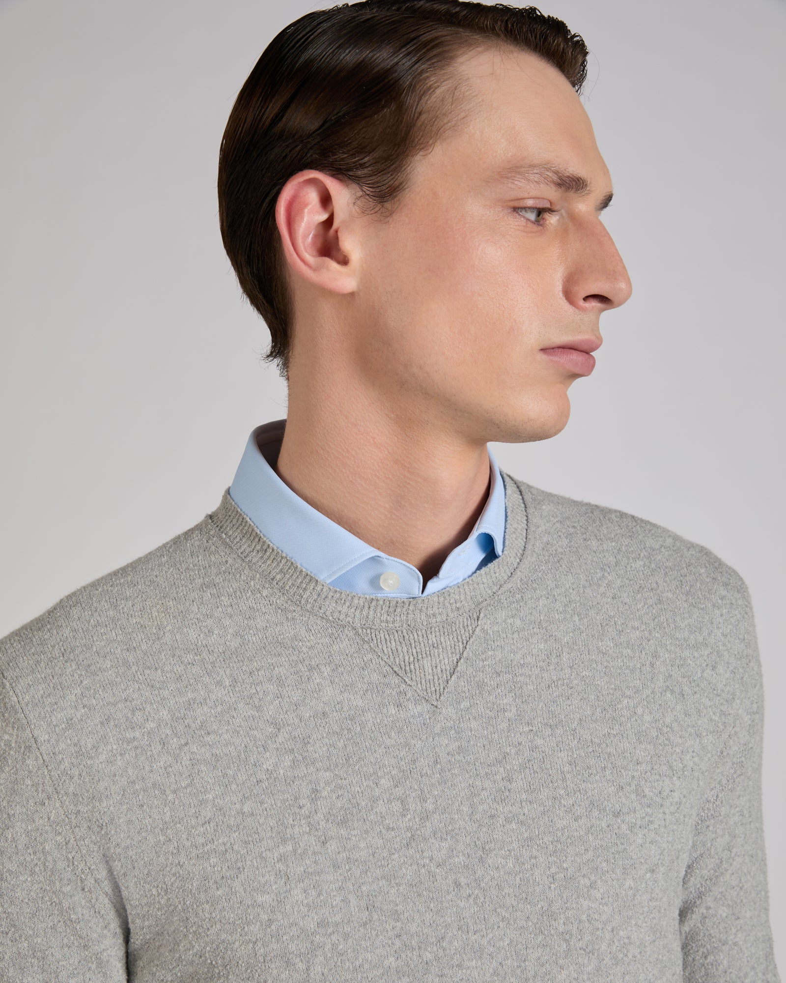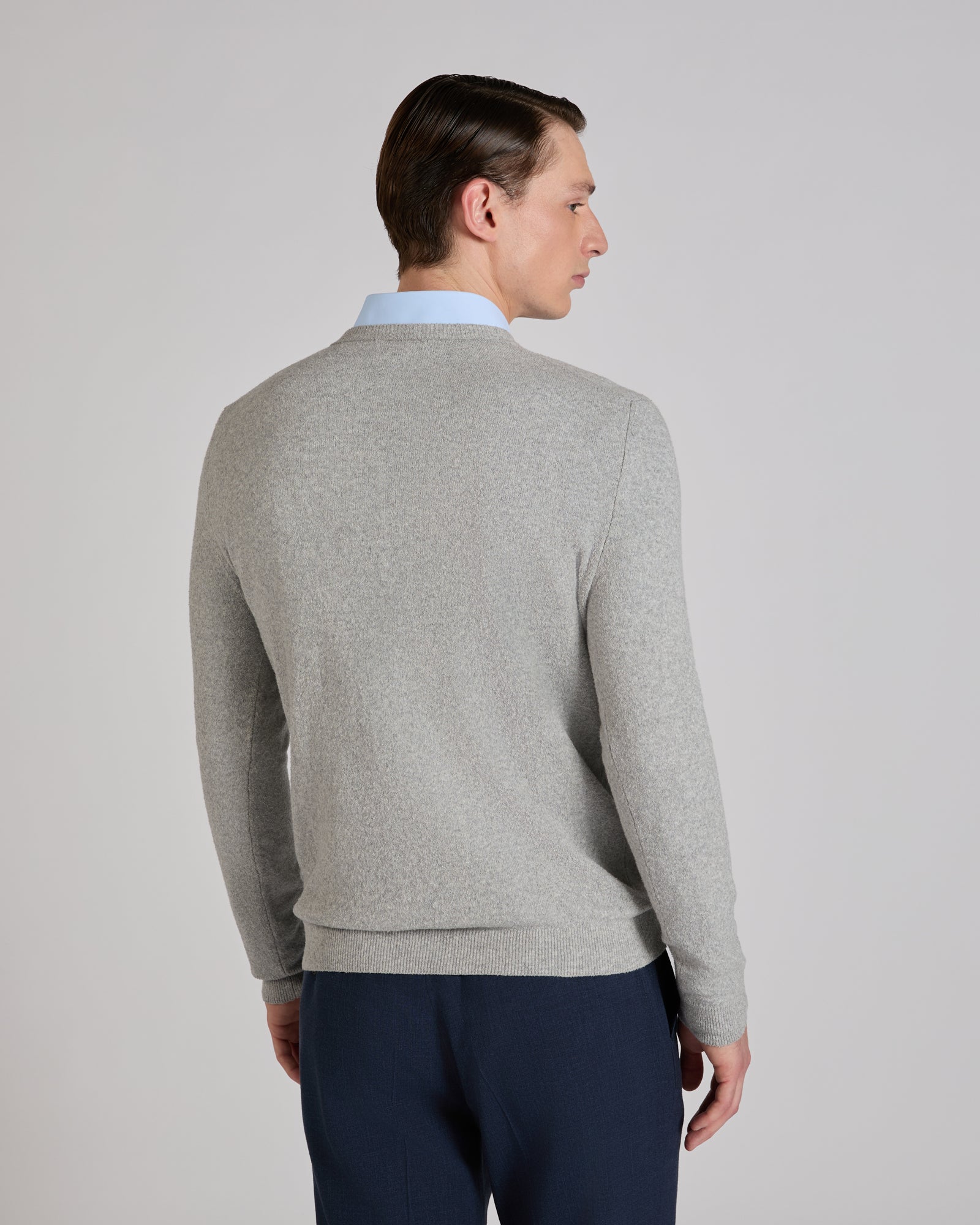 This slim-fit crew neck revisits a wardrobe classic with a textured, contemporary twist. It is made of cotton bouclé, a type of weave featuring small loops and knots that create an uneven, three-dimensional surface. This particular effect adds depth to the garment, making it soft to the touch and a distinctive look. The fabric is a soft cotton that is produced through a certified process that ensures worker safety and respect for the environment at all stages of production.
