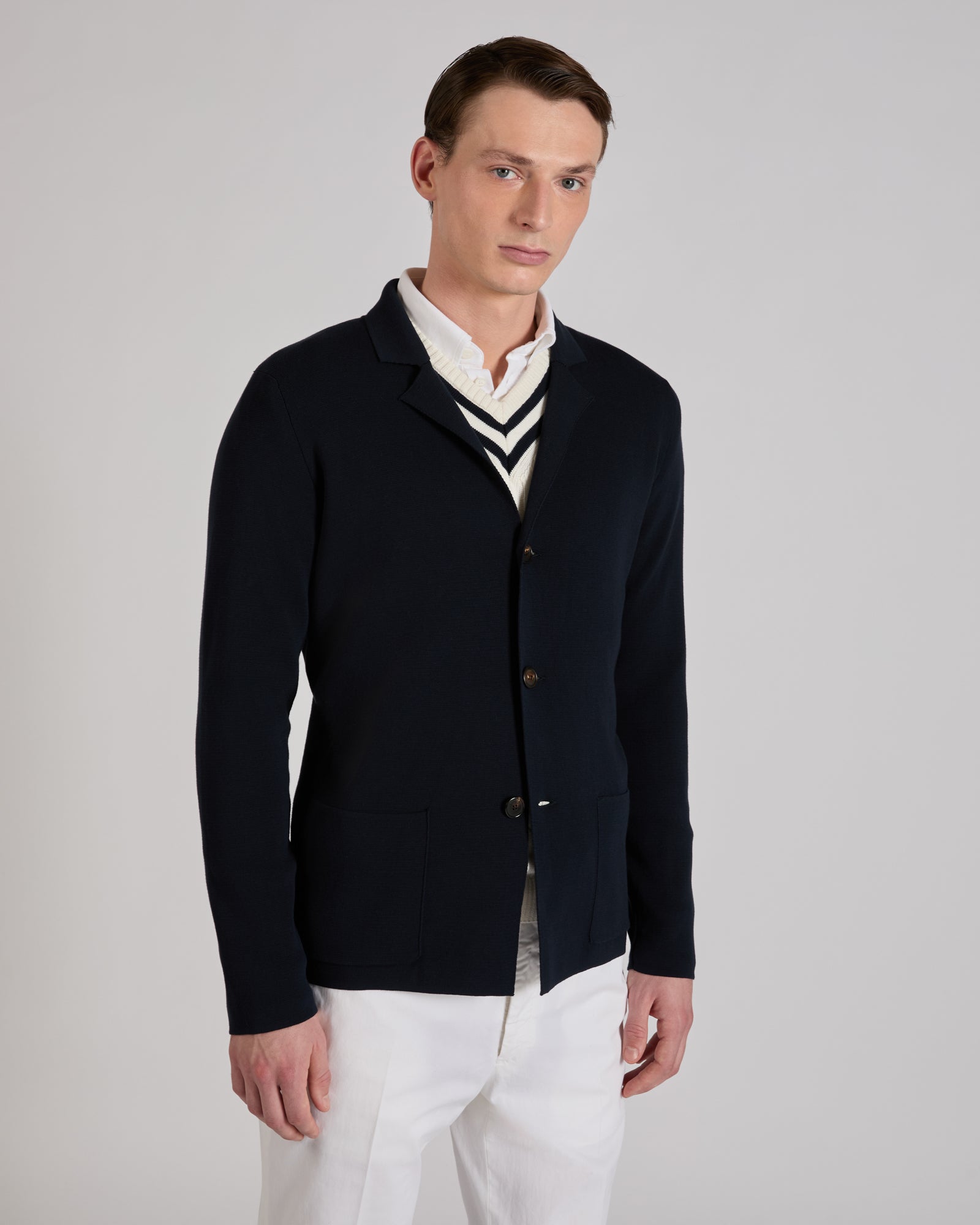 A hybrid between outerwear and knitwear, this crepe cotton jacket combines the natural sophistication of the design with the soft comfort of cotton. The fabric is characterised by the iconic material and textured feel of crepe cotton, selected for its superior quality and produced through a certified process that guarantees the safety of people and the environment and minimises the use of harmful chemicals at all stages of production. With its close fit, this model offers maximum versatility of use.