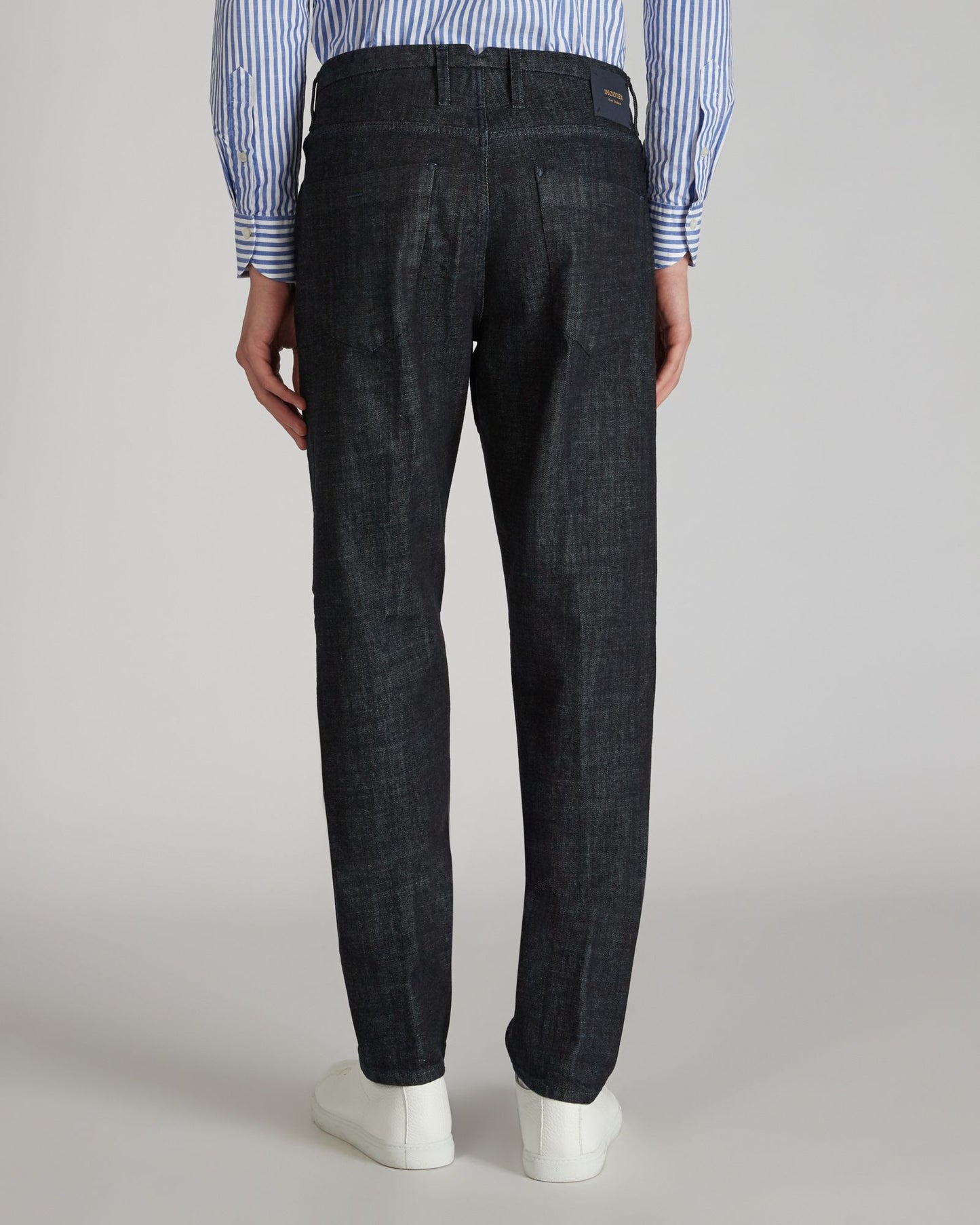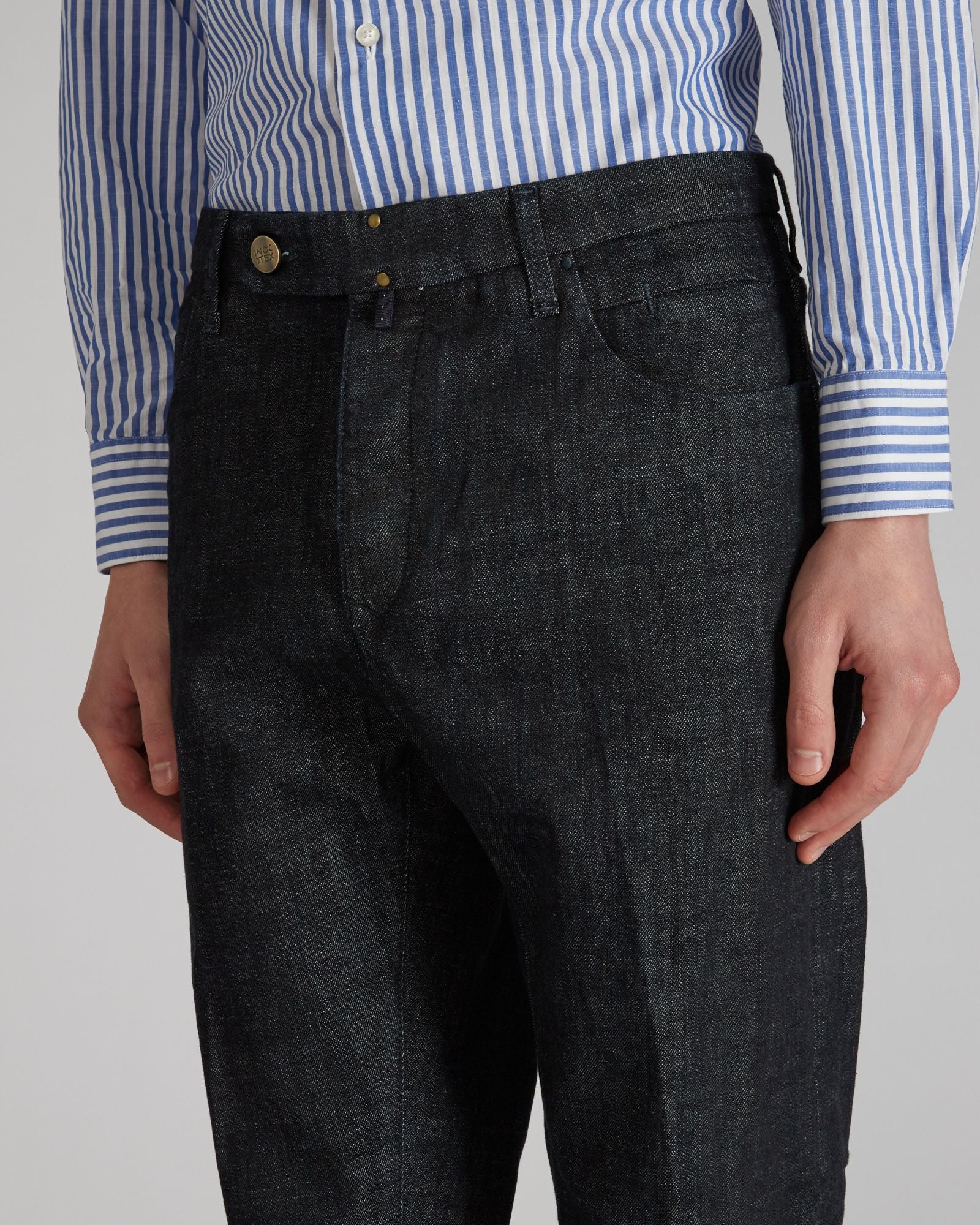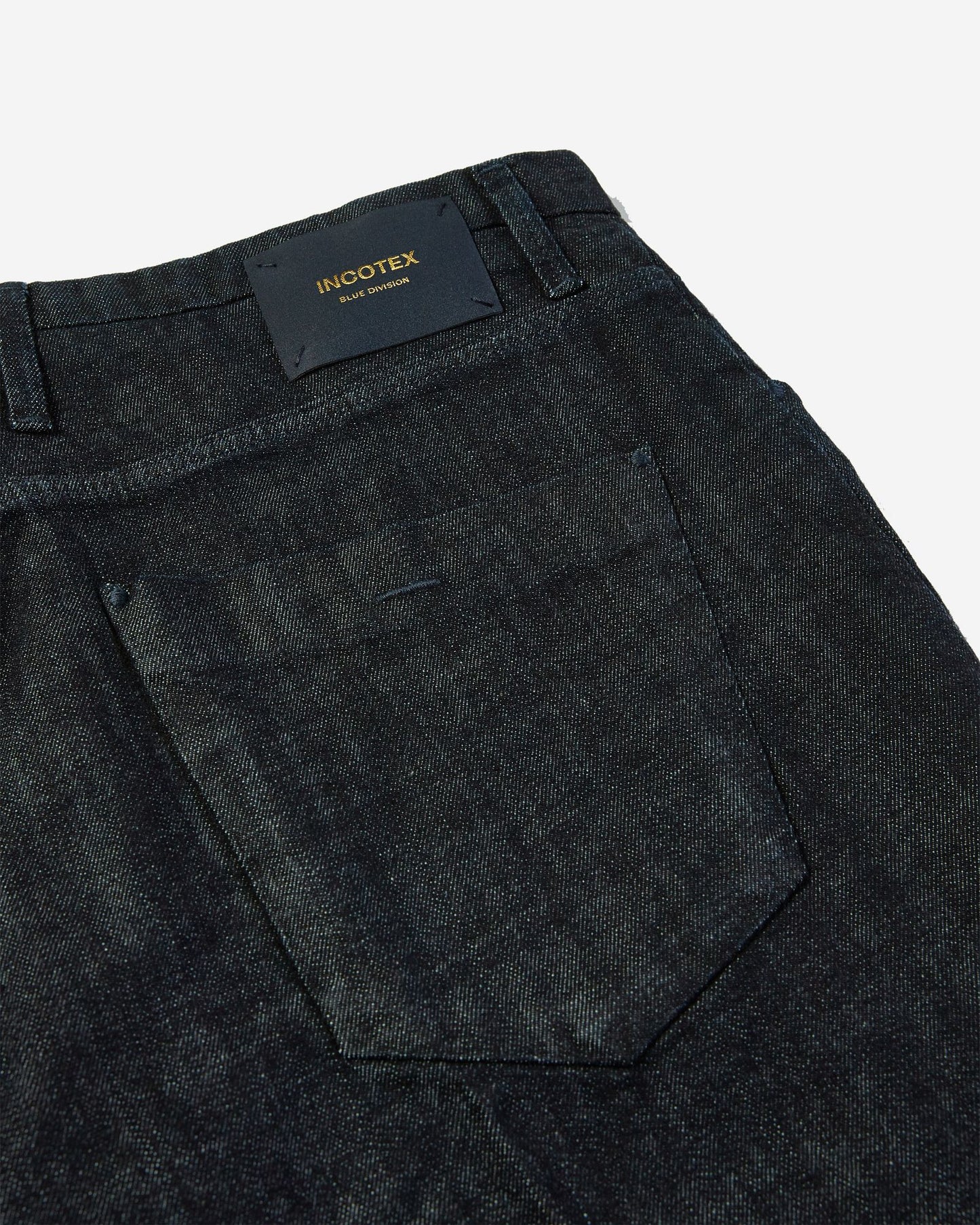 When denim meets tailoring, the result is a five-pocket trouser that redefines the essence of the garment. This is the goal of the Incotex Blue Division brand, which here offers a slim-fit trouser inspired by fine tailoring with details like the belt design and the twin coin pockets on the front. The dark blue wash gives an intense colour.