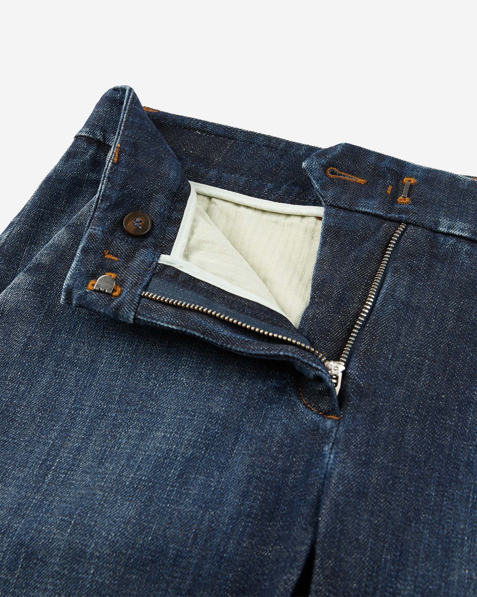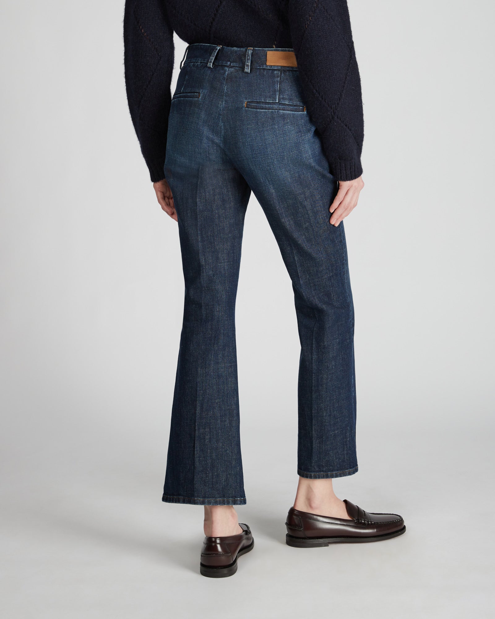 - The trousers have slash front pockets, single-welt rear pockets and flared leg hems.