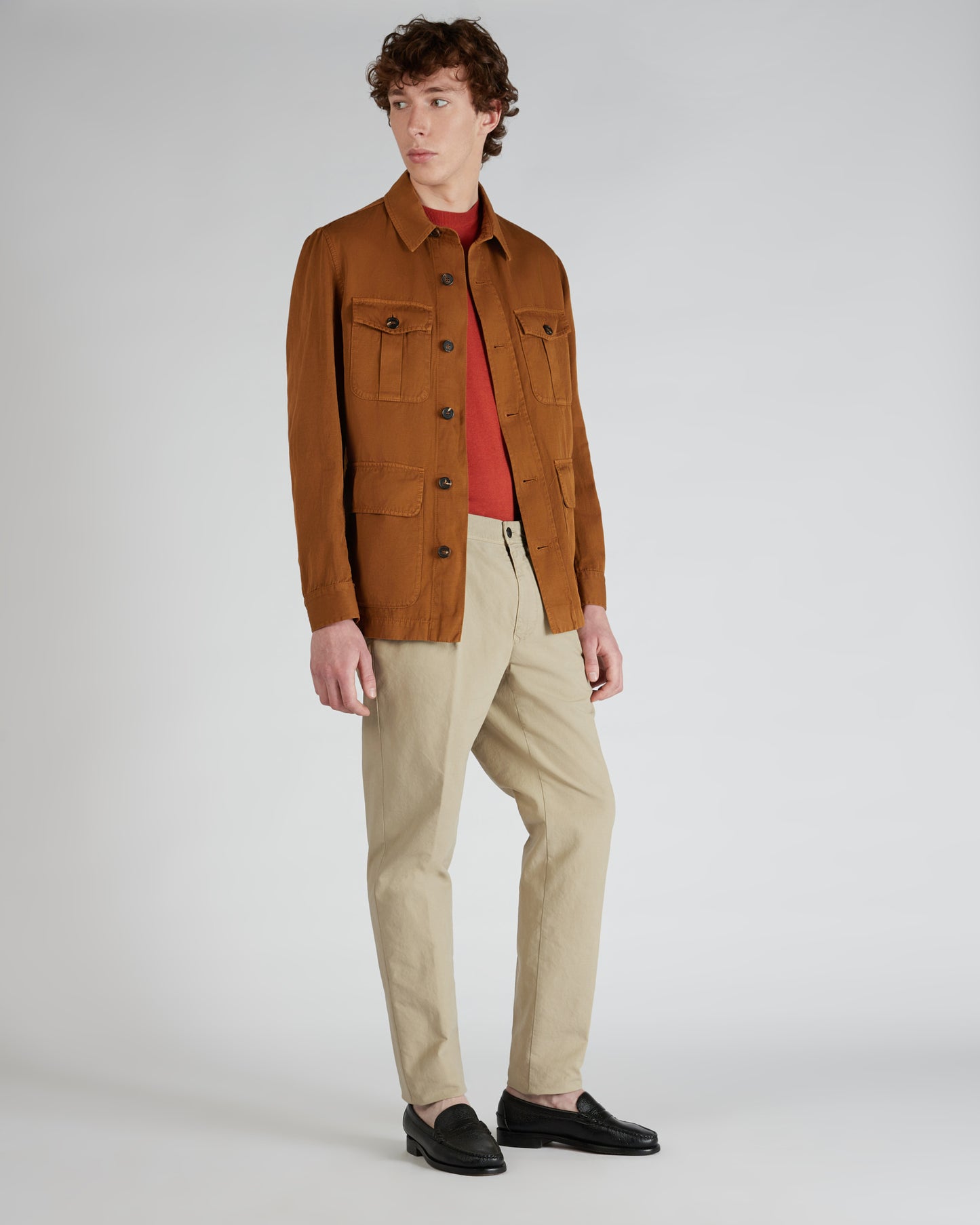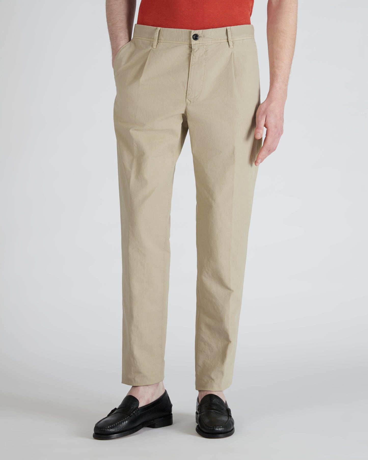 These trousers combine the minimal style of a versatile garment with sartorial details, such as the front pleat that helps to soften the volumes of the fit. It is made from soft, light stretch cotton with an original weave that gives a silky appearance. The cotton is produced through a certified process to minimise the use of harmful chemical substances at all stages of production.
